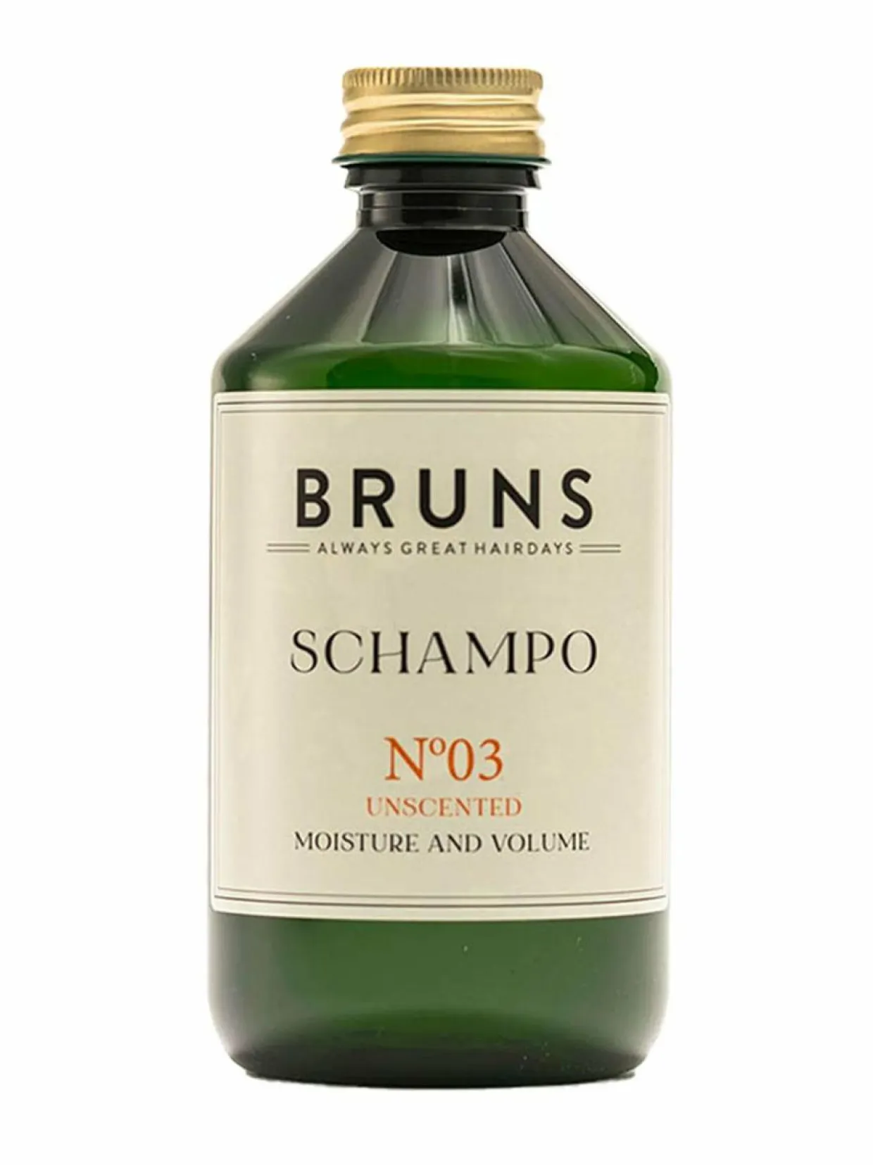 Bruns Products №03 Unscented Shampoo on käsintehty hajusteeton shampoo, joka sopii ärtyneelle ja herkälle hiuspohjalle sekä perheen pienimmille. Shampoo kehitettiin koko perheen käyttöön, huomioiden myös tuoksuherkät sekä odottavat äidit. Shampoo sisältää luomuguarkumia, joka tuuheuttaa hiuksia samalla, kun luomujojobaöljy suojaa ja hoitaa herkkää hiuspohjaa.