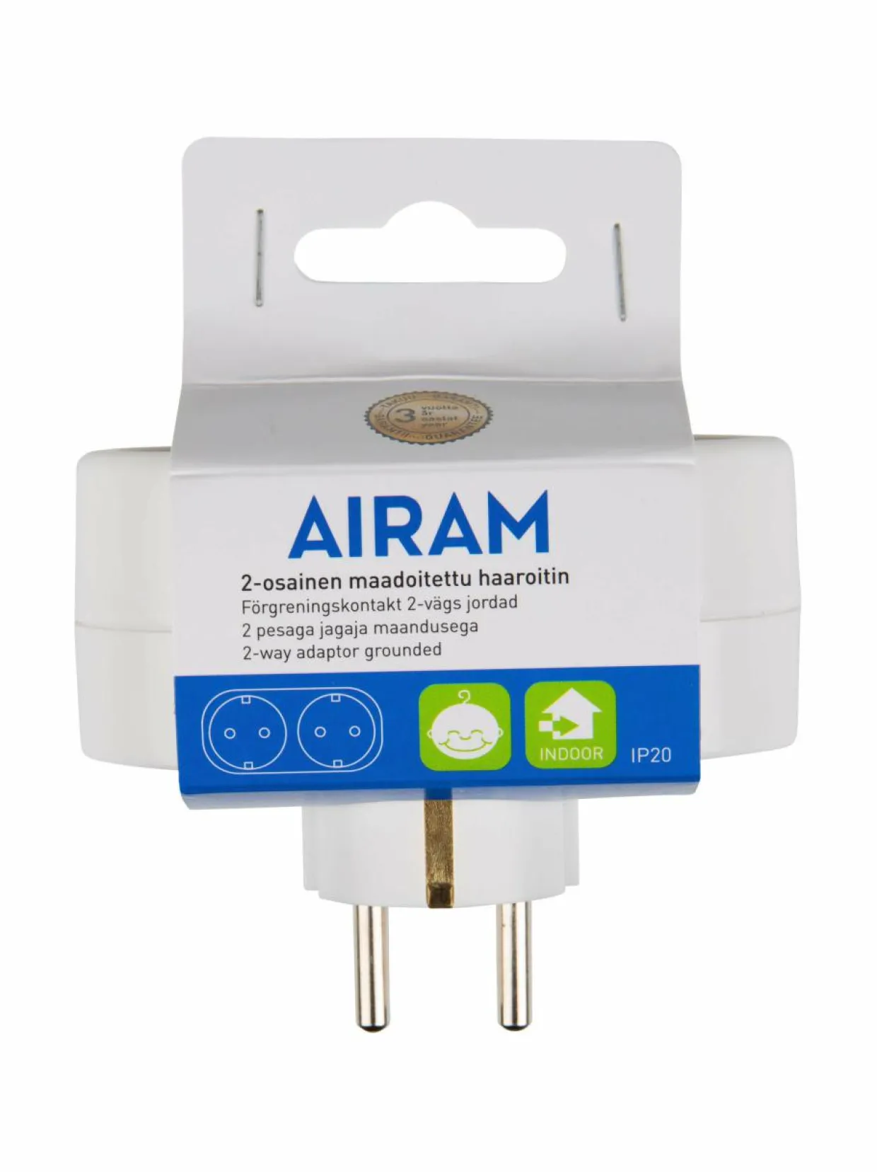 Sisäkäyttöön tarkoitettu valkoinen haaroitin sopii euro- ja suko-pistotulppaisille johdoille. Tuote on lapsiturvallinen.