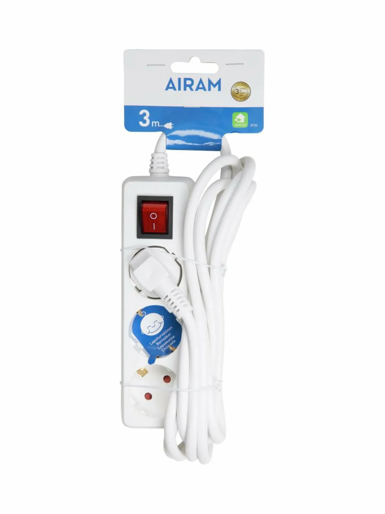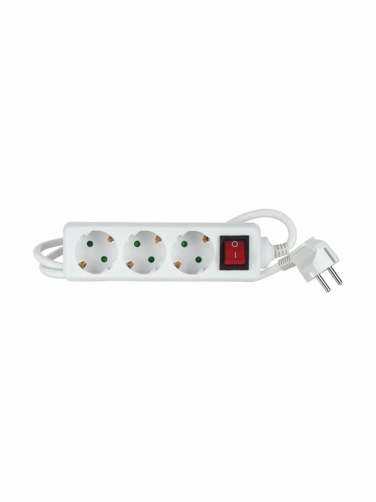 3-osainen jatkojohto+kytkin 3m. Kaapeli H05VV-F 3×1,5mm². Valkoinen. Vain sisäkäyttöön, IP20.