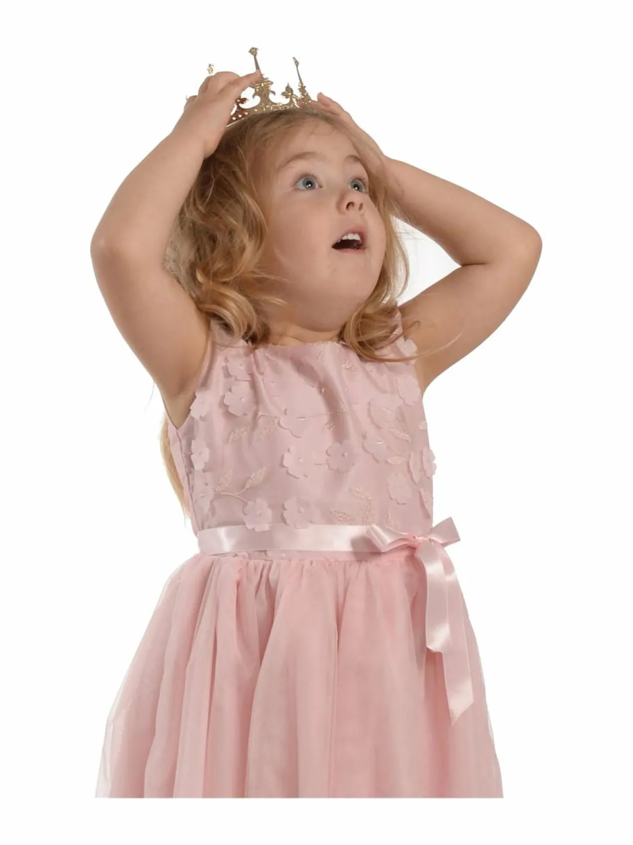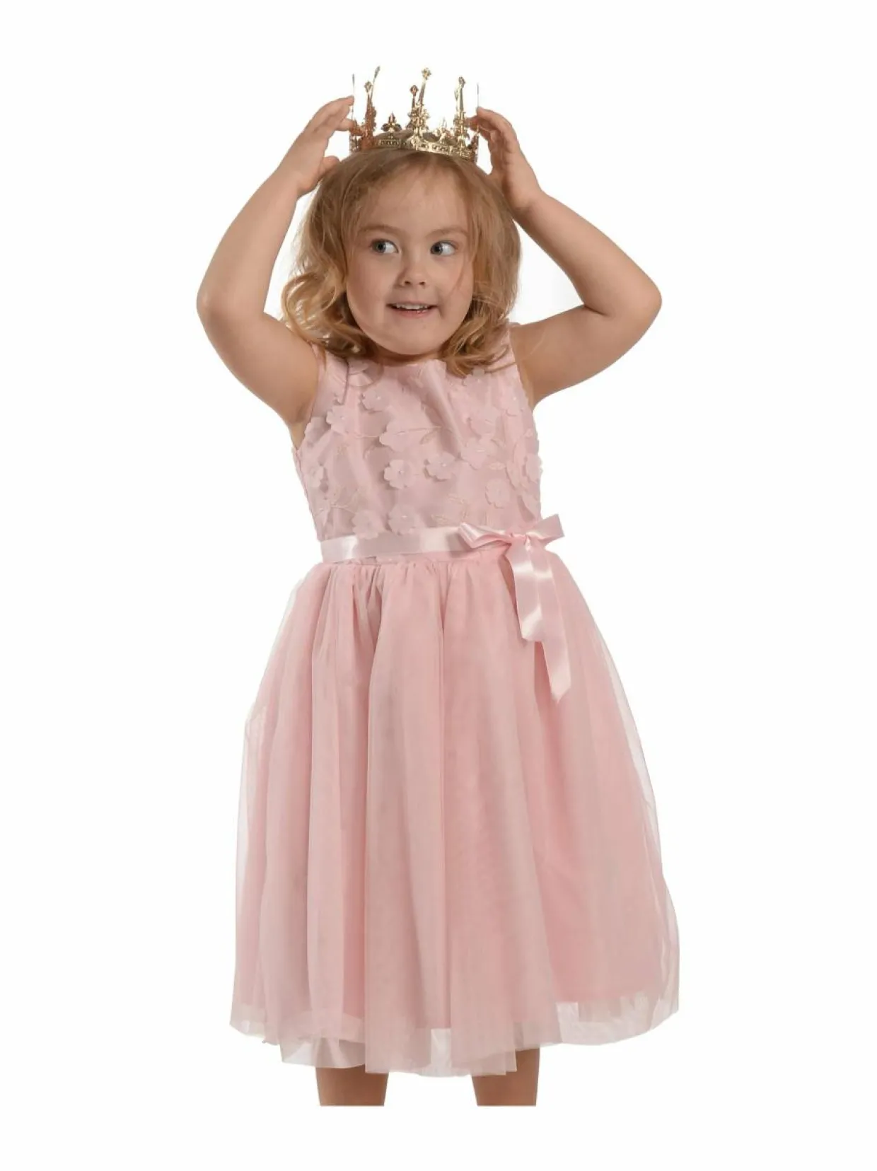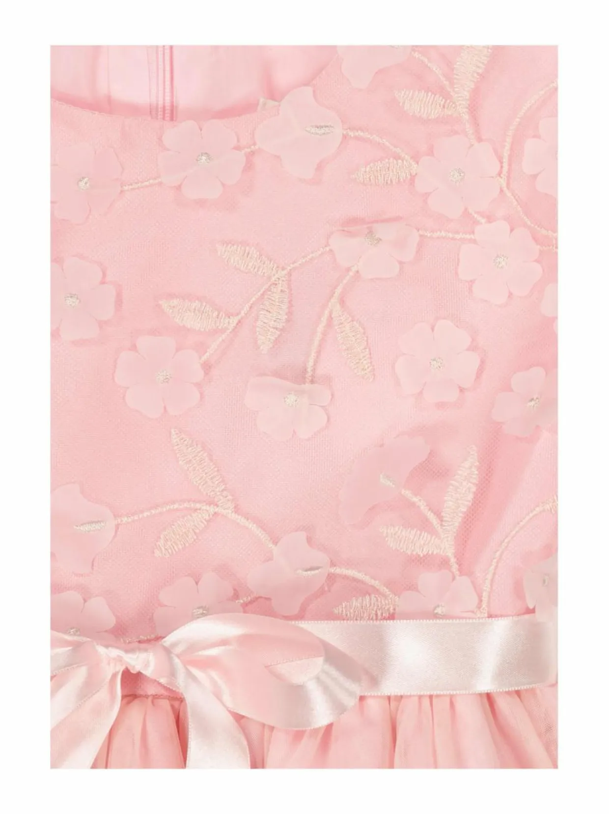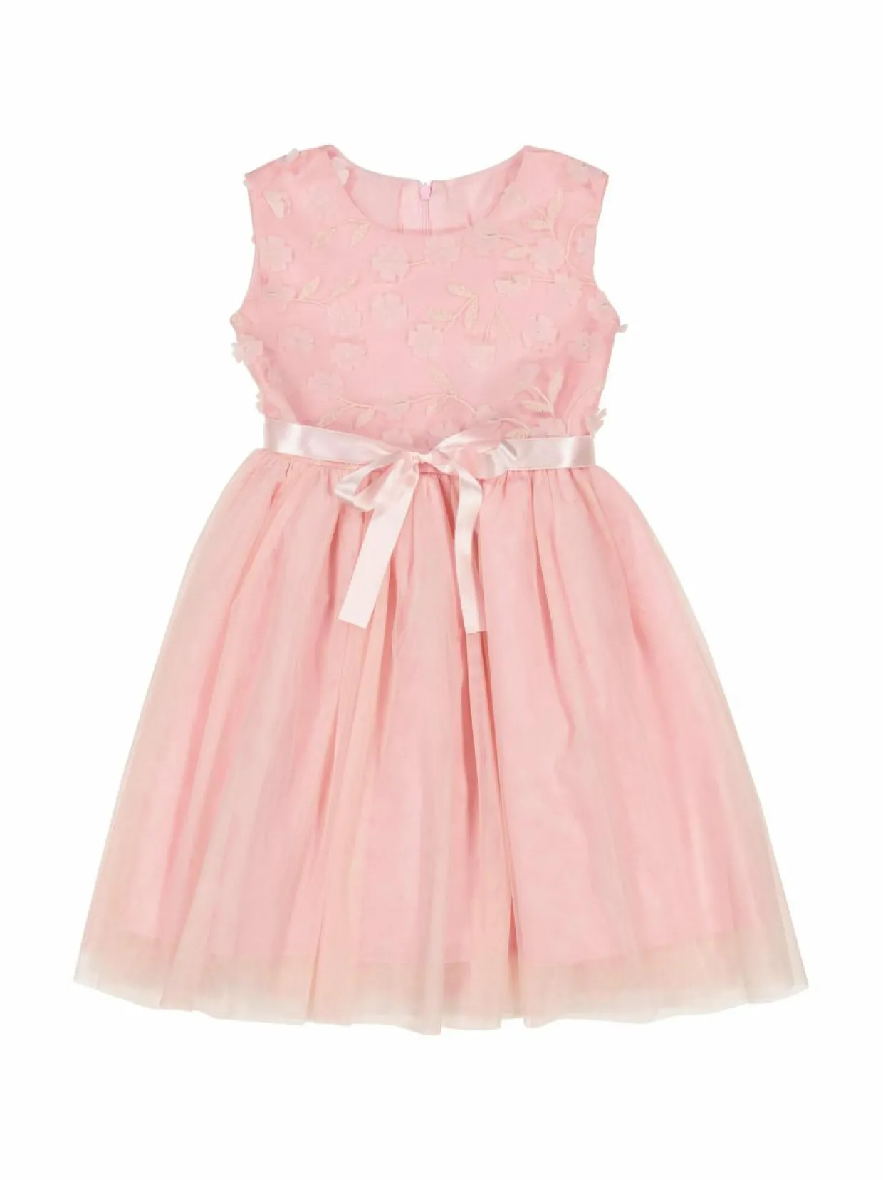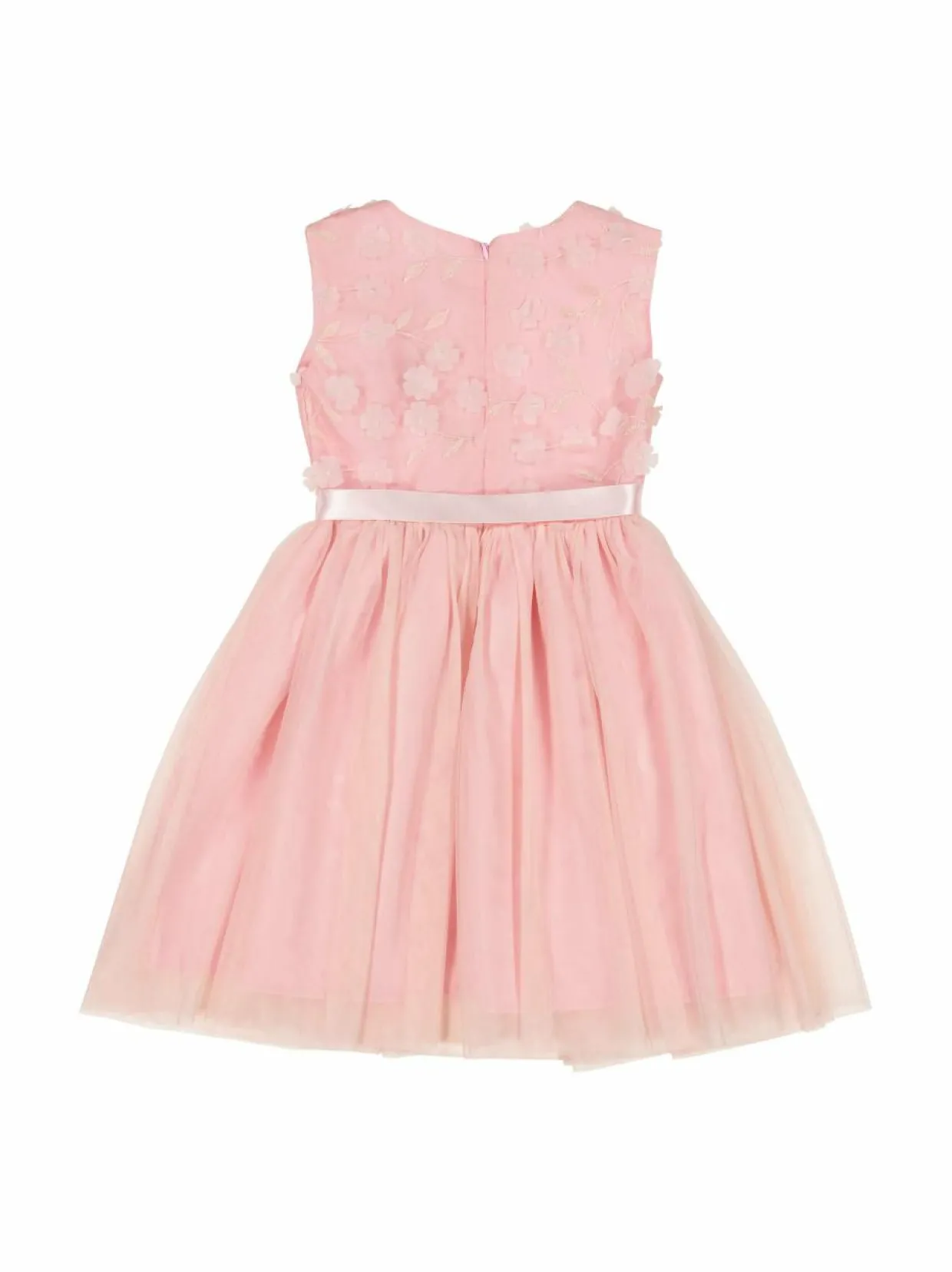 Ihastuttava juhlamekko tyllihelmalla ja hihattomalla yläosalla, jossa kohotetut 3D- kukka-applikaatiot. Vyötäröllä solmittava satiininauha. Kauniin mekon pukemista helpottaa takaosan vetoketju.