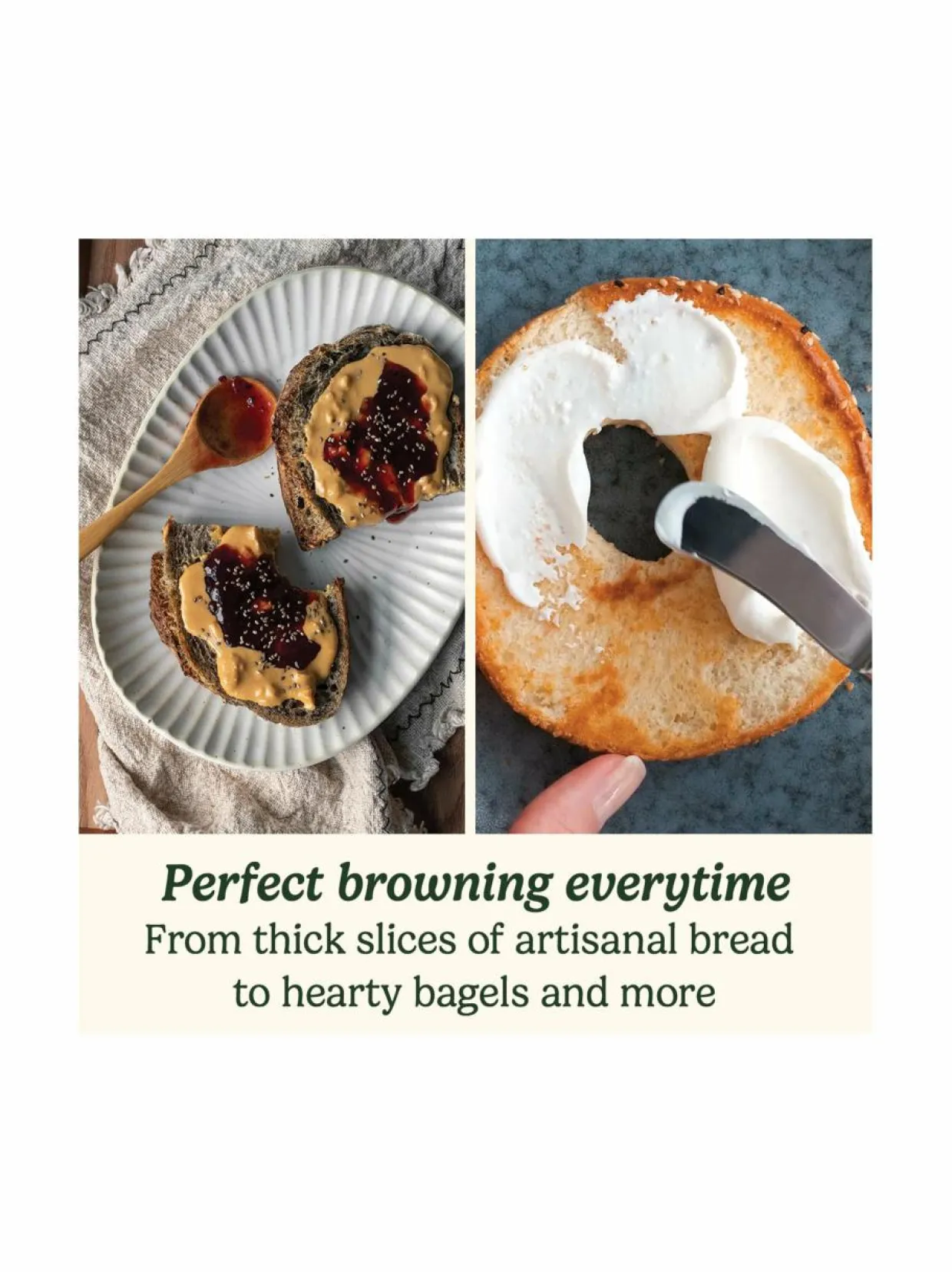 Erittäin syvät paahtoaukot on muotoiltu sopimaan korkeille leipäviipaleille, minkä ansiosta koko leipäviipale paahtuu tasaisesti. Säätömahdollisuuksien ansiosta voit paahtaa leivän haluamallasi tavalla. Käytä lämmitystoimintoa paahtoleivän lämmittämiseen polttamatta sitä ja sulatustoimintoa leivän sulattamiseen ja paahtamiseen samalla kertaa. Bagel-toiminto paahtaa hitaammin ja antaa parhaan tuloksen paksuille leiville, sämpylöille, muffineille ja bageleille.