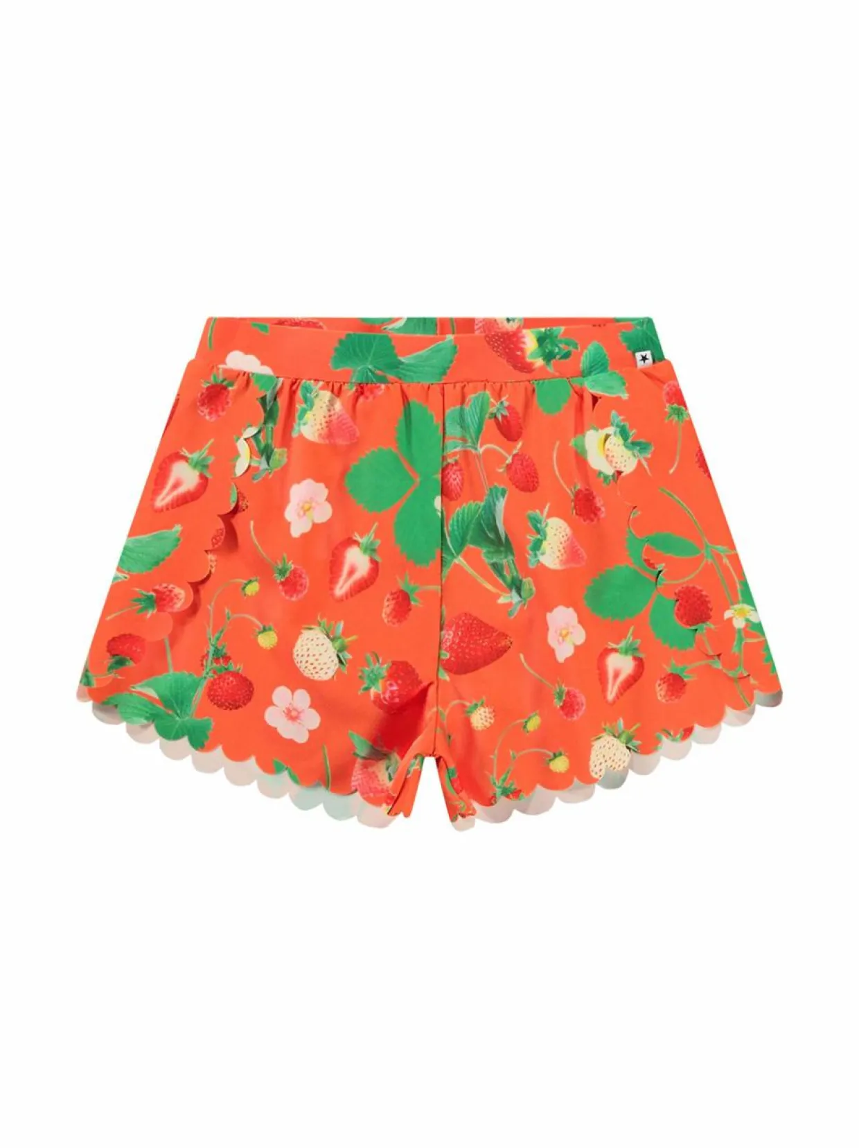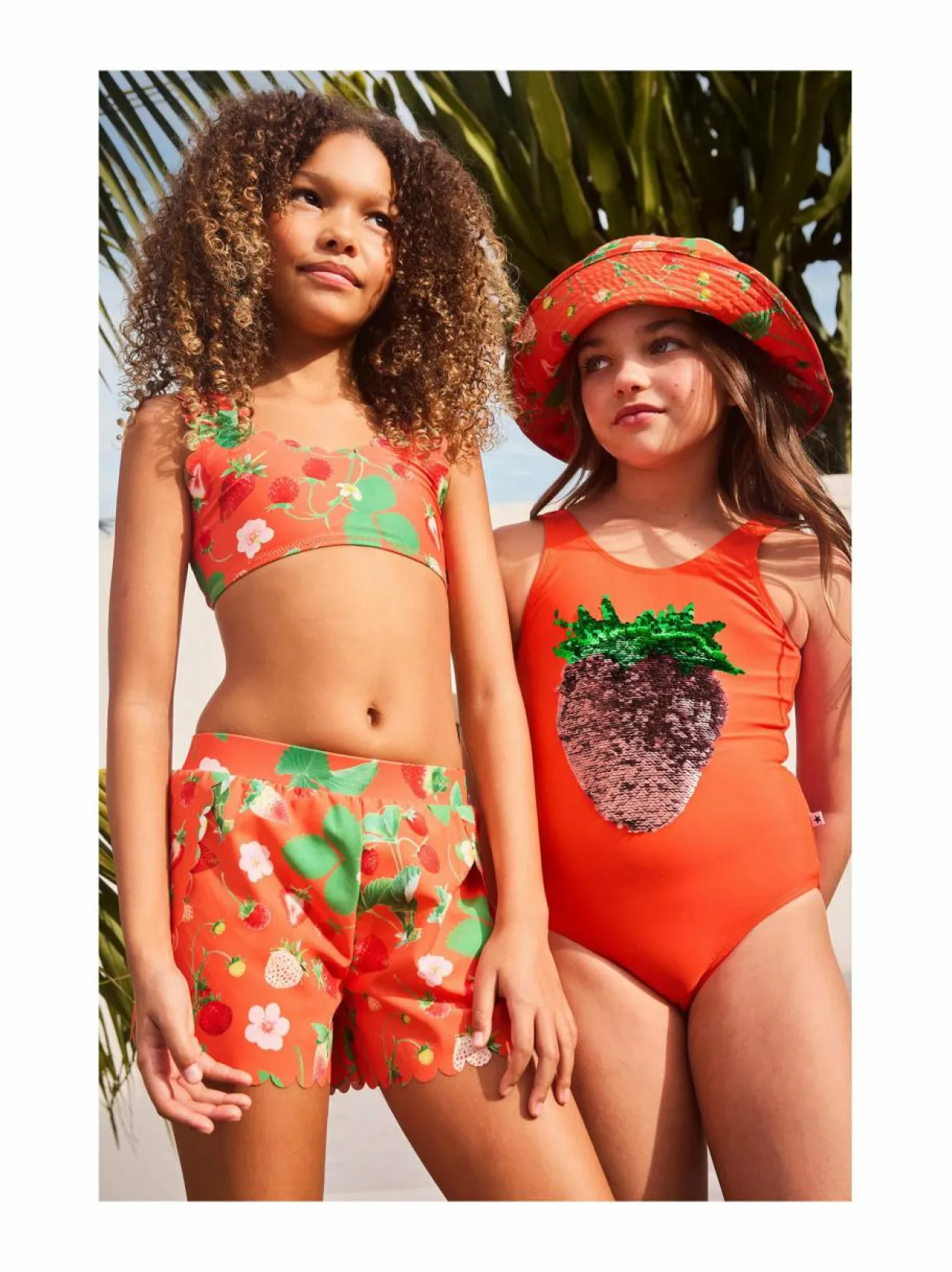 Molon 6-uimashortsit on valmistettu pehmeästä ja nopeasti kuivuvasta materiaalista, joka koostuu kierrätetystä polyesteristä. Uimahousuissa on kaunis mansikkakuvio ja aaltoileva helma. Ne ovat mukavat ja käytännölliset uimiseen ja leikkimiseen. 92 % materiaalista on kierrätettyä polyesteriä.