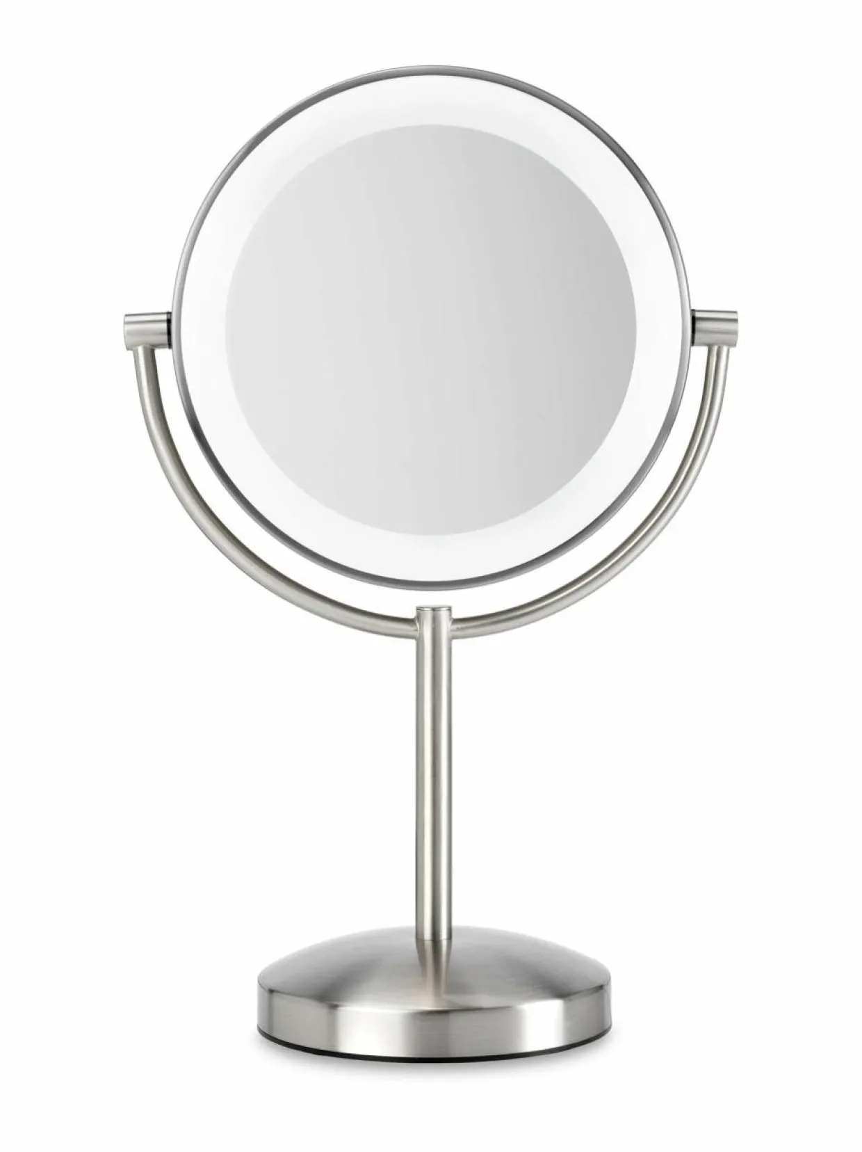 Kaksipuolinen pöytäpeili. Toinen puoli peilaa 8 x suurentavasti. Reunoilla kirkas LED-valo, joka luo meikkaamista varten ihanteellisen surround-valaistuksen. Peilissä on 2,7 m johto ja virtanappi. Ruostumatonta terästä.