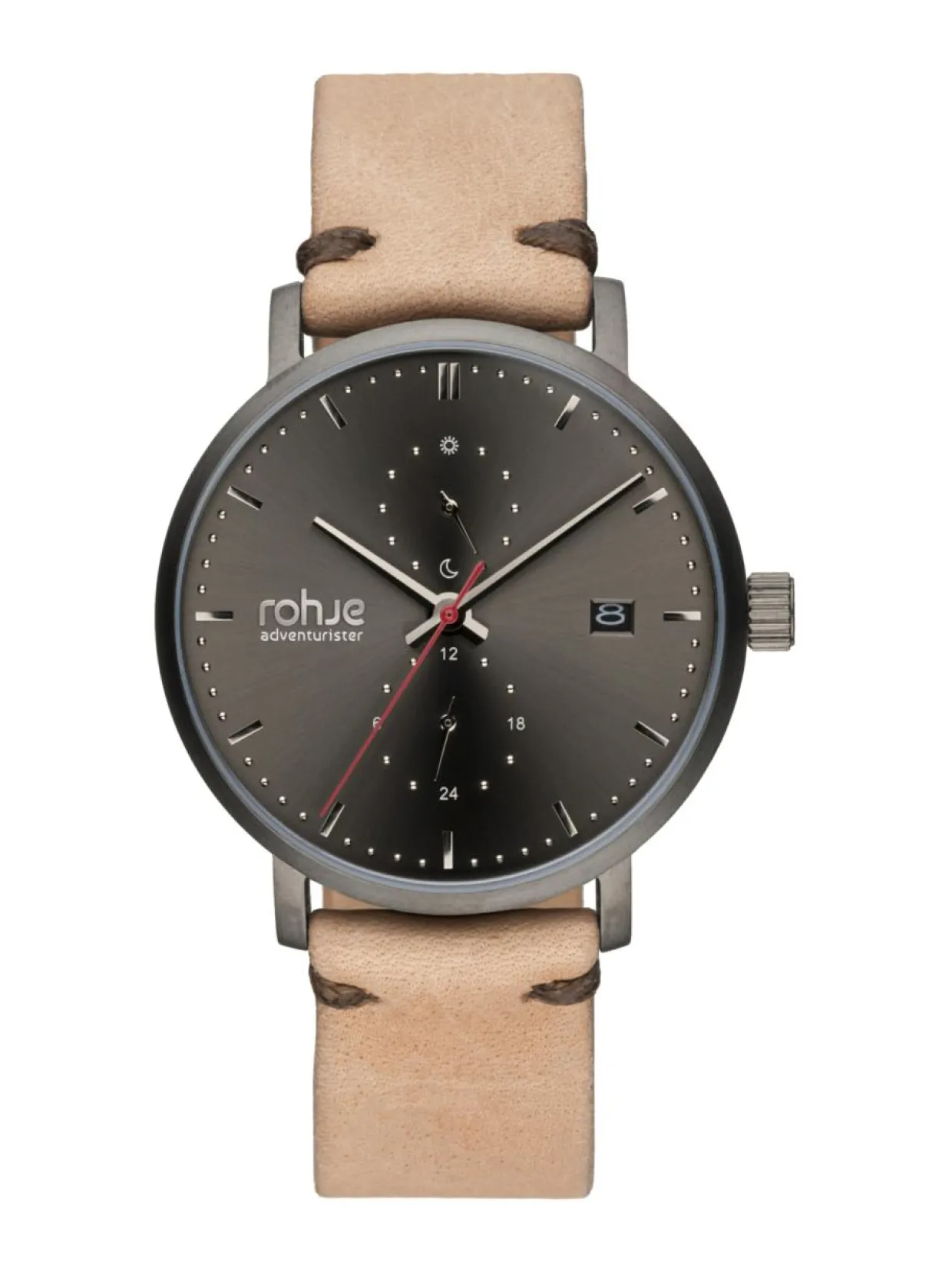 Rohje-rannekello on suomalaista muotoilua. Hillityn ulkoasunsa ansiosta Rohje Adventurister Dark poronnahkaisella rannekkeella sopii tilanteeseen kuin tilanteeseen aina luonnosta urbaaniin ympäristöön, juhlaan sekä arkeen. Poronnahkaranneke on suomalaista käsityötä. Sopivan kokoisen runkonsa ansiosta (halkaisija: 40 mm ja kellon paksuus vain 8,2 mm) kello on tehty seikkailuihin. Runko on harjattua ruostumatonta kirurginterästä (316L) ja kellon safiirilasi kestää kovemmatkin seikkailut. Kevyen painon, kestävien materiaalien, vedenkestävyyden (5 ATM) ja kaksoisaika-toiminnallisuuden ansiosta se on luottoasuste.