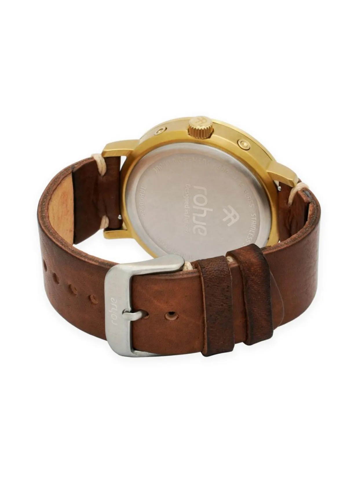 Rohje-rannekello on suomalaista muotoilua. Hillityn ulkoasunsa ansiosta Rohje Adventurister Gold poronnahkaisella rannekkeella sopii tilanteeseen kuin tilanteeseen aina luonnosta urbaaniin ympäristöön, juhlaan sekä arkeen. Poronnahkaranneke on suomalaista käsityötä. Sopivan kokoisen runkonsa ansiosta (halkaisija: 40 mm ja kellon paksuus vain 8,2 mm) kello on tehty seikkailuihin. Runko on harjattua ruostumatonta kirurginterästä (316L) ja kellon safiirilasi kestää kovemmatkin seikkailut. Kevyen painon, kestävien materiaalien, vedenkestävyyden (5 ATM) ja kaksoisaika-toiminnallisuuden ansiosta se on luottoasuste.