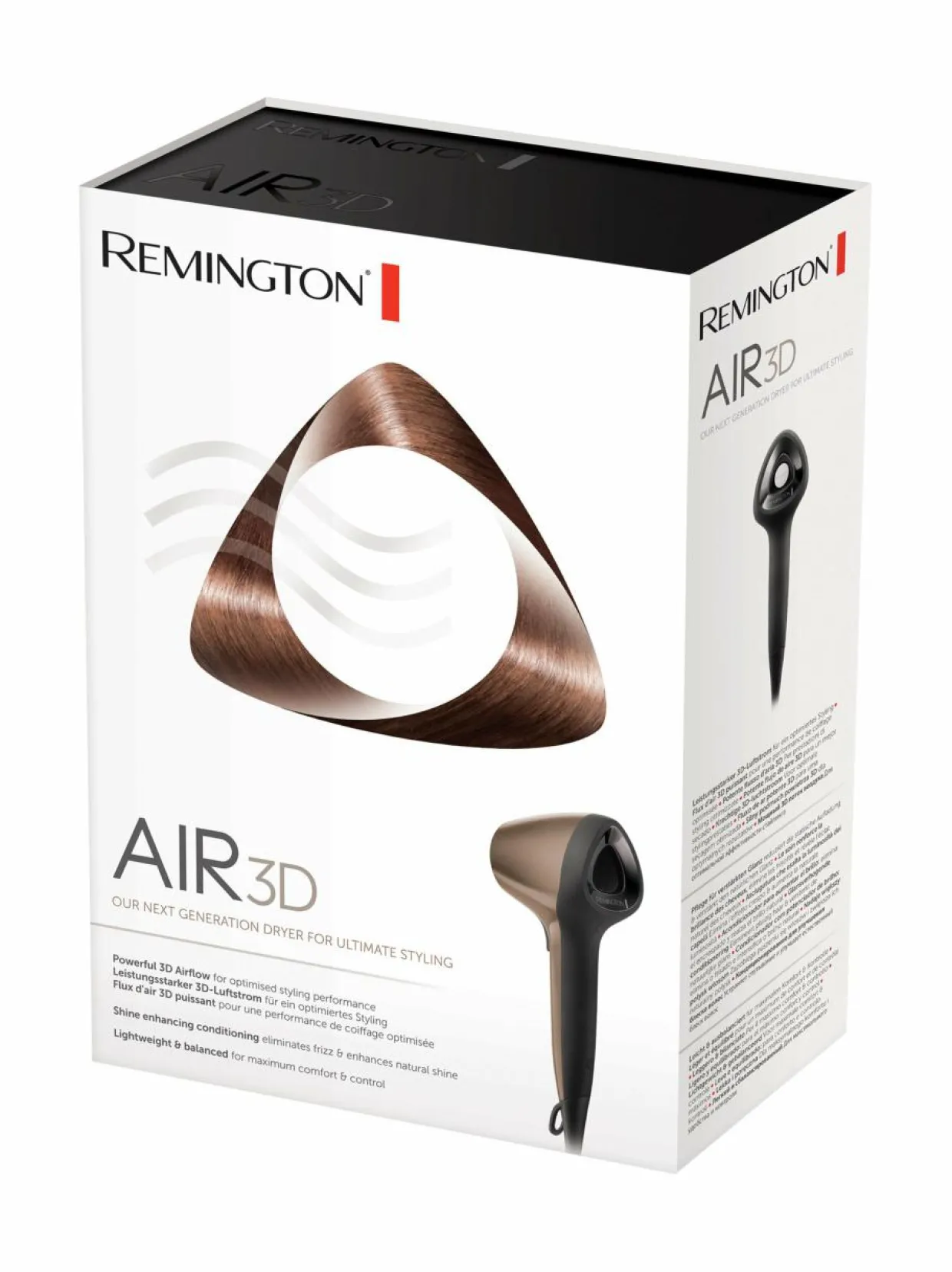 Remington Air3D -hiustenkuivaimessa yhdistyvät kaksi tehokkaaseen hiusten kuivaamiseen tarvittavaa elementtiä – ainutlaatuinen 3D-ilmavirta ja ihanteelliset lämpötilat halutun hiustyylin saavuttamiseen nopeasti.