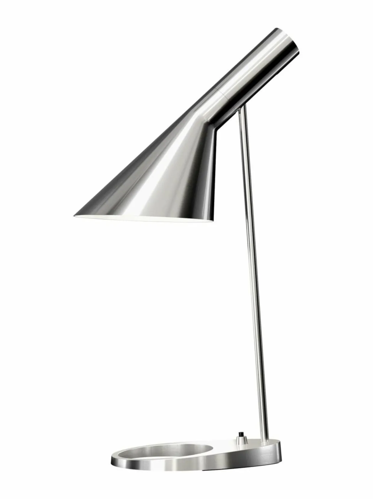 Arne Jacobsen suunnitteli yksinkertaisen tyylikkään AJ-valaisimen vuonna 1960 Kööpenhaminan Radisson SAS Royal -hotelliin. Ajattoman muotokielensä ansiosta valaisin sopii hyvin monenlaiseen ympäristöön. Kallistuva varjostin voidaan säätää haluttuun asentoon ja kohdistaa valo juuri sinne, missä sitä tarvitaan. Valaisimen korkeus on 56 cm, varjostimen pituus 35 cm ja jalustan halkaisija 21,5 cm.