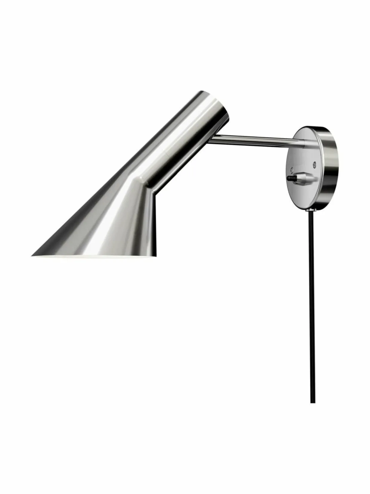 Arne Jacobsen suunnitteli yksinkertaisen tyylikkään AJ-valaisimen vuonna 1960 Kööpenhaminan Radisson SAS Royal -hotelliin. Ajattoman muotokielensä ansiosta valaisin sopii hyvin monenlaiseen ympäristöön. Kallistuva varjostin voidaan säätää haluttuun asentoon ja kohdistaa valo juuri sinne, missä sitä tarvitaan. Valaisin luo suoran valon, joten se soveltuu erinomaisesti lukuvaloksi. Varjostimen pituus on 25 cm, korkeus 18 cm, syvyys 32 cm ja seinäkiinnikkeen halkaisija 9 cm. Sähköjohdon väri on musta.