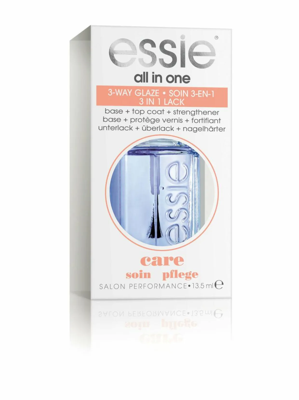 Essien All-in-one -kynsilakka on sekä alus- että päällyslakka. Se suojaa ja vahvistaa lakkausta antaen samalla kauniin kiiltävän lakkapinnan. Sisältää myös hoitavaa argan-öljyä.