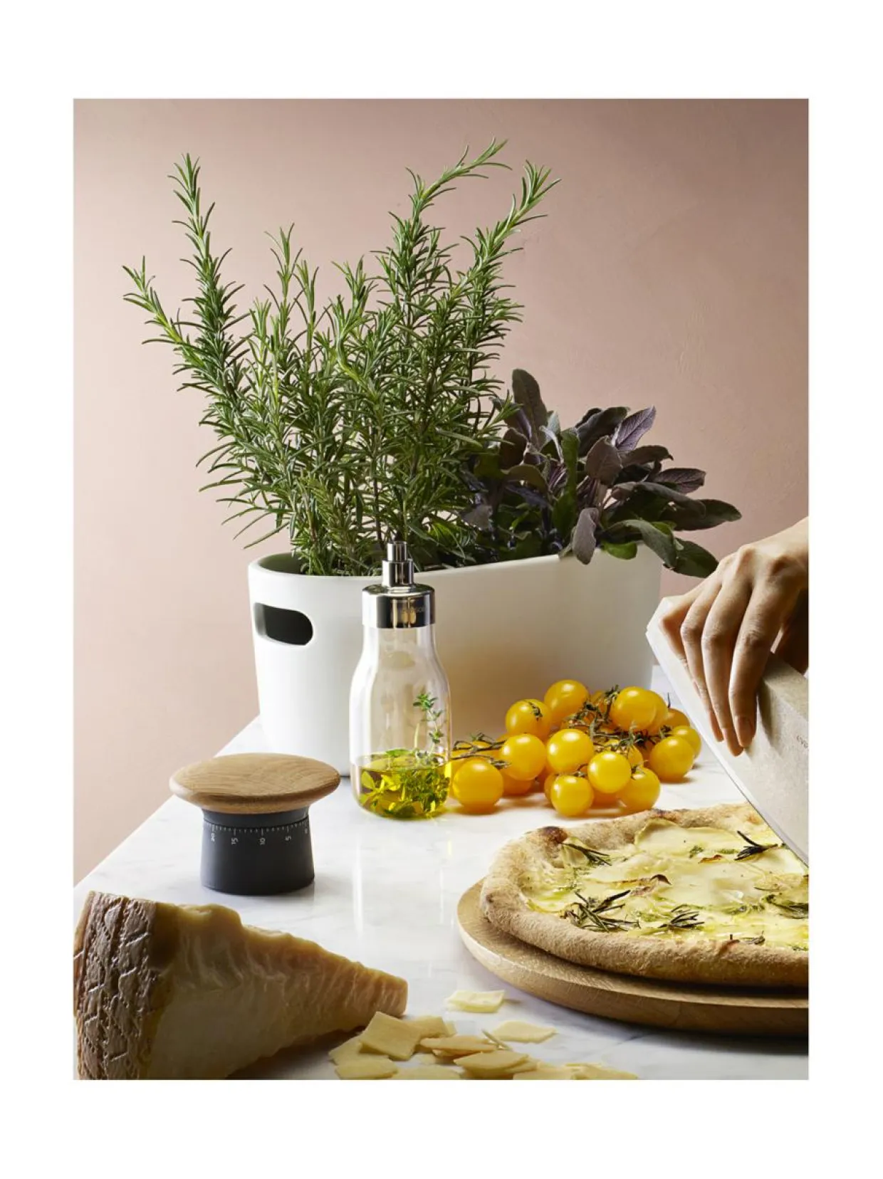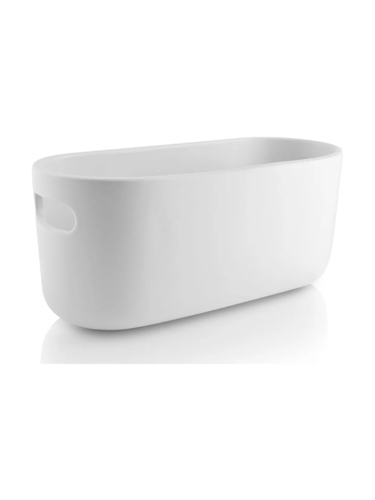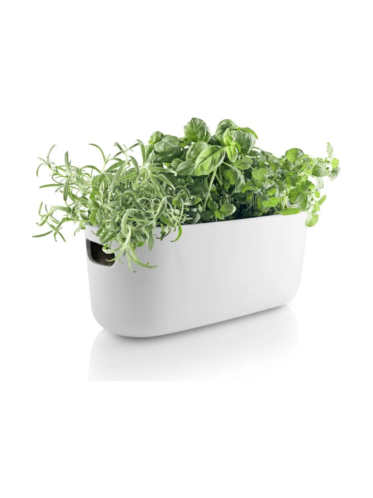 Eva Solon keraamisessa yrttilaatikossa on tilaa useammalle ruukulle, joten siihen saa koottua näyttävän kokonaisuuden erilaisia yrttejä niiden omissa ruukuissa. Yksinkertainen altakastelujärjestelmä perustuu kapillaari-ilmiöön ja sen avulla yrtit pystyvät ottamaan juuri tarvitsemansa määrän vettä 500 ml:n säiliöstä laatikon pohjalta. Näin kastelun tarve vähenee ja yrtit pysyvät elinvoimaisina, vaikka kukaan ei olisi muutamaan päivään kotona niistä huolehtimassa. Kädensijojen ansiosta laatikko on helppo siirtää esimerkiksi keittiöstä parvekkeelle ja takaisin. Soveltuu sekä sisä- että ulkokäyttöön, mutta vain lämpötilan ollessa plussan puolella. Kapillaariselle kankaalle suosittelemme käsinpesua haalealla vedellä, mutta kaikki muut osat voi pestä astianpesukoneessa.
