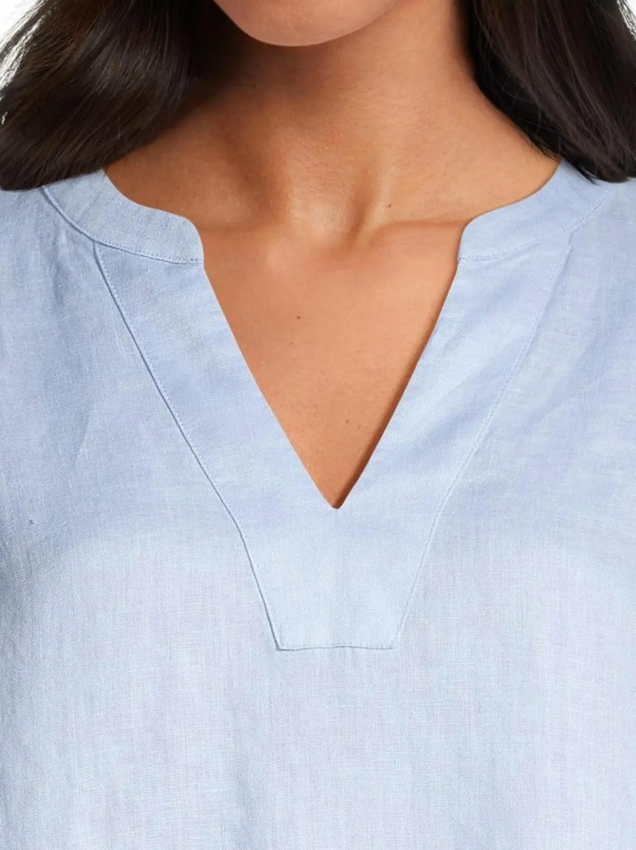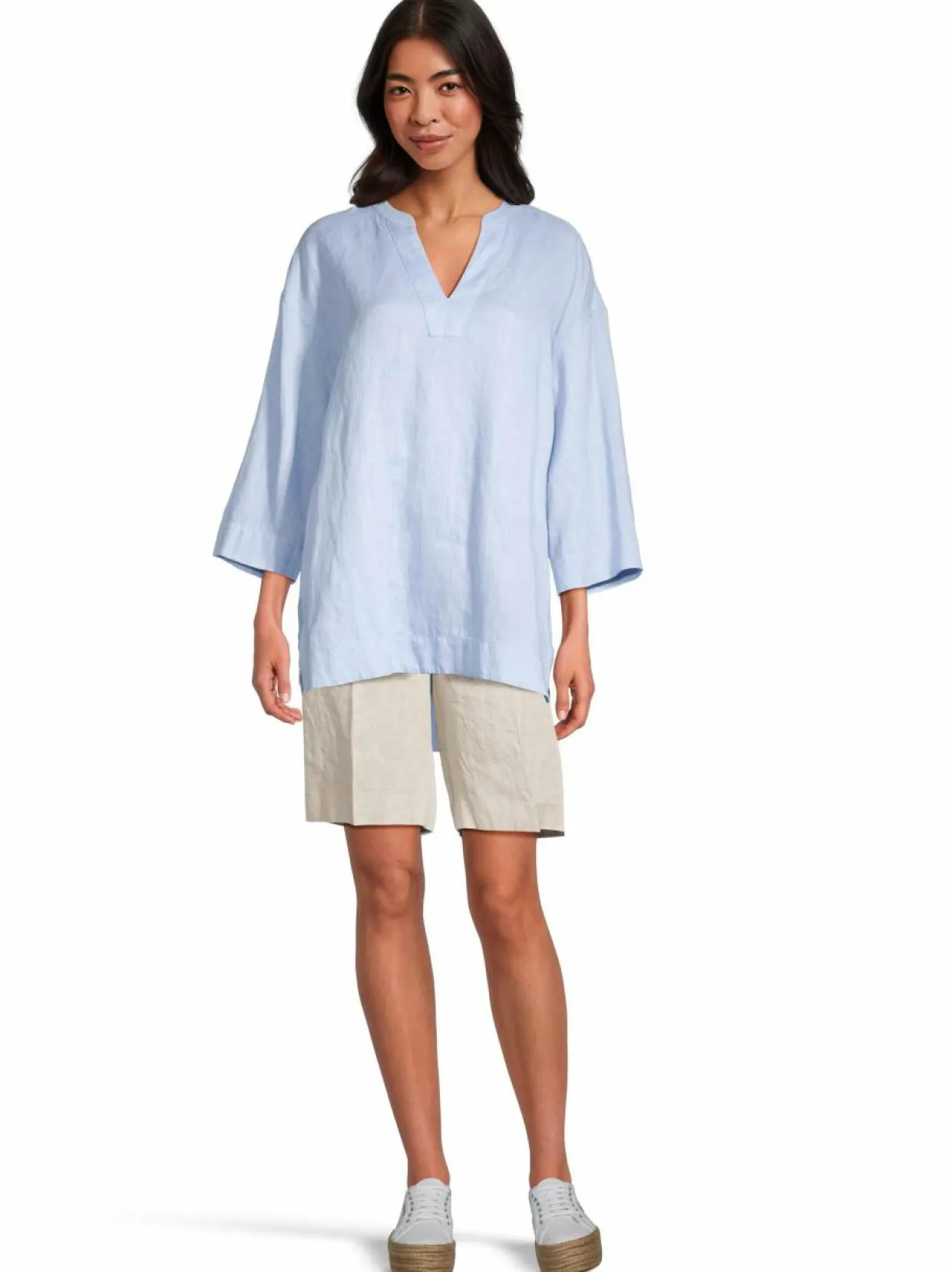 Rennosti laskeutuva Amalia-pellavatunika on takaa hieman pidempi kuin edestä. Pellava on luonnollinen ja ihanan viileän tuntuinen materiaali – oikein hoidettuina pellavavaate kestää vuosia hyvässä kunnossa. Tunikassa on puolipitkät hihat, pienet helmahalkiot ja imarteleva v-pääntie. Helma on hieman kaareva.