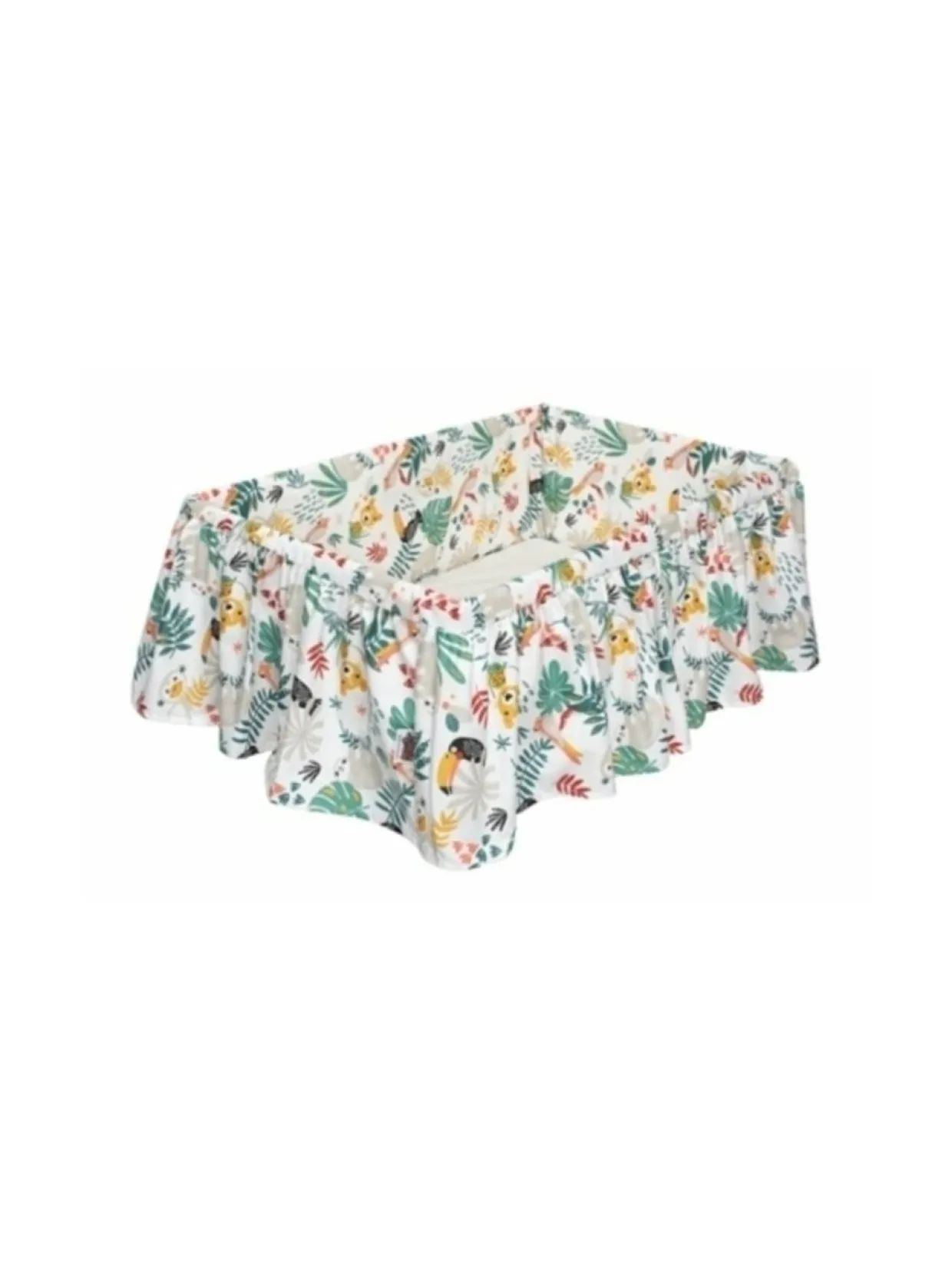 Äitiyspakkauksen reunapehmuste Anne & Mikael on tropiikki-kuvioinen pehmuste. Reunapehmuste sopii kokonsa puolesta äitiyspakkaukseen ja pehmustaa kovat reunat mukaviksi vauvalle. Reunapehmuste myös somistaa äitiyspakkauksen pahvikuoren, jolloin vauvan ensisänky näyttää erityisen somalta. Konepestävä.