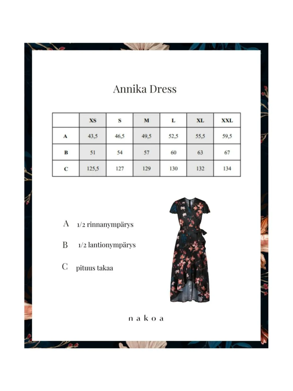 Nakoan Annika Dress on naisellinen katseenvangitsija. Valekietaisumalli ja eri tavoin solmittava vyötärönauha varmistavat istuvuuden jokaiselle vartalolle ja imartelevat muotoleikkaukset luovat kauniin siluetin korostaen juuri oikeita kohtia. Helmassa ja hihoissa toistuvat hulmuavat, aaltoilevat muotolaskokset laskeutuvat kevyellä kankaalla kauniisti. Versailles kuosin Annika mekko on vuoreton.