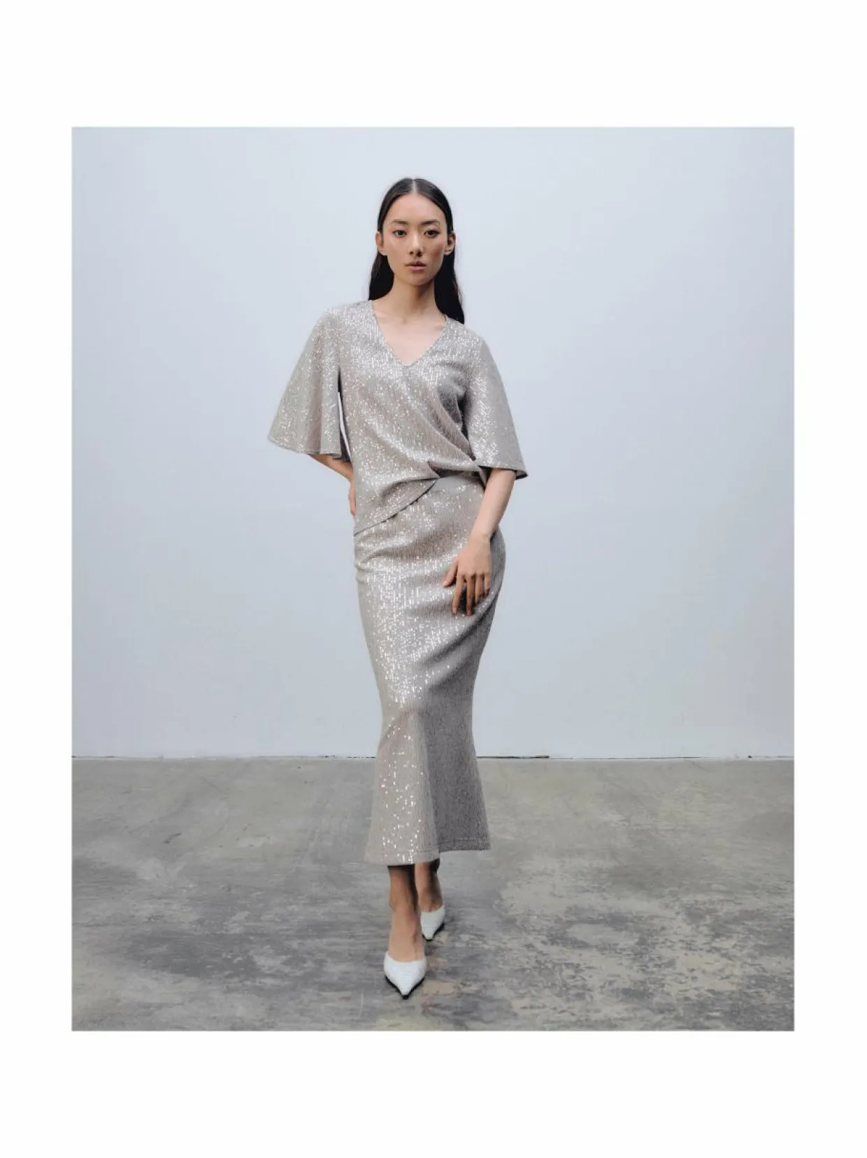 Materiaali97 % polyesteri, 3 % elastaani PesuohjeetKäsinpesu VäriGREIGE SILVER Avainsanathame, juhlava hame, pitkä hame, paljettihame, Ida Sjöstedt, juhlahame, kimalteleva hame