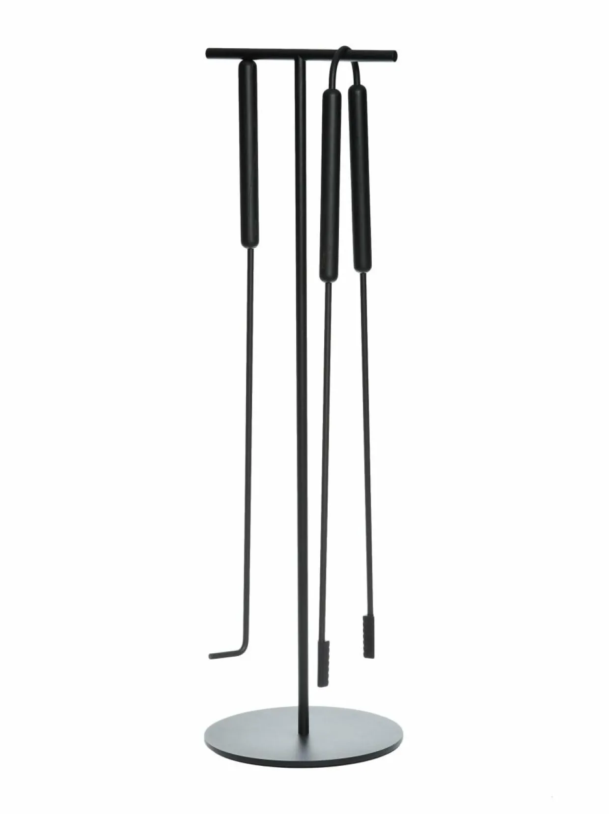 Korutelineistä inspiraatiota ammentava takkatarvikesetti. Settiin kuuluu hiilihanko, pihdit ja elegantti teline. Tämä setti auttaa varmasti pitämään takkasi ympäristön siistinä! Ergonominen muotoilu, jossa yhdistyy tammi ja puuteripintainen teräs.