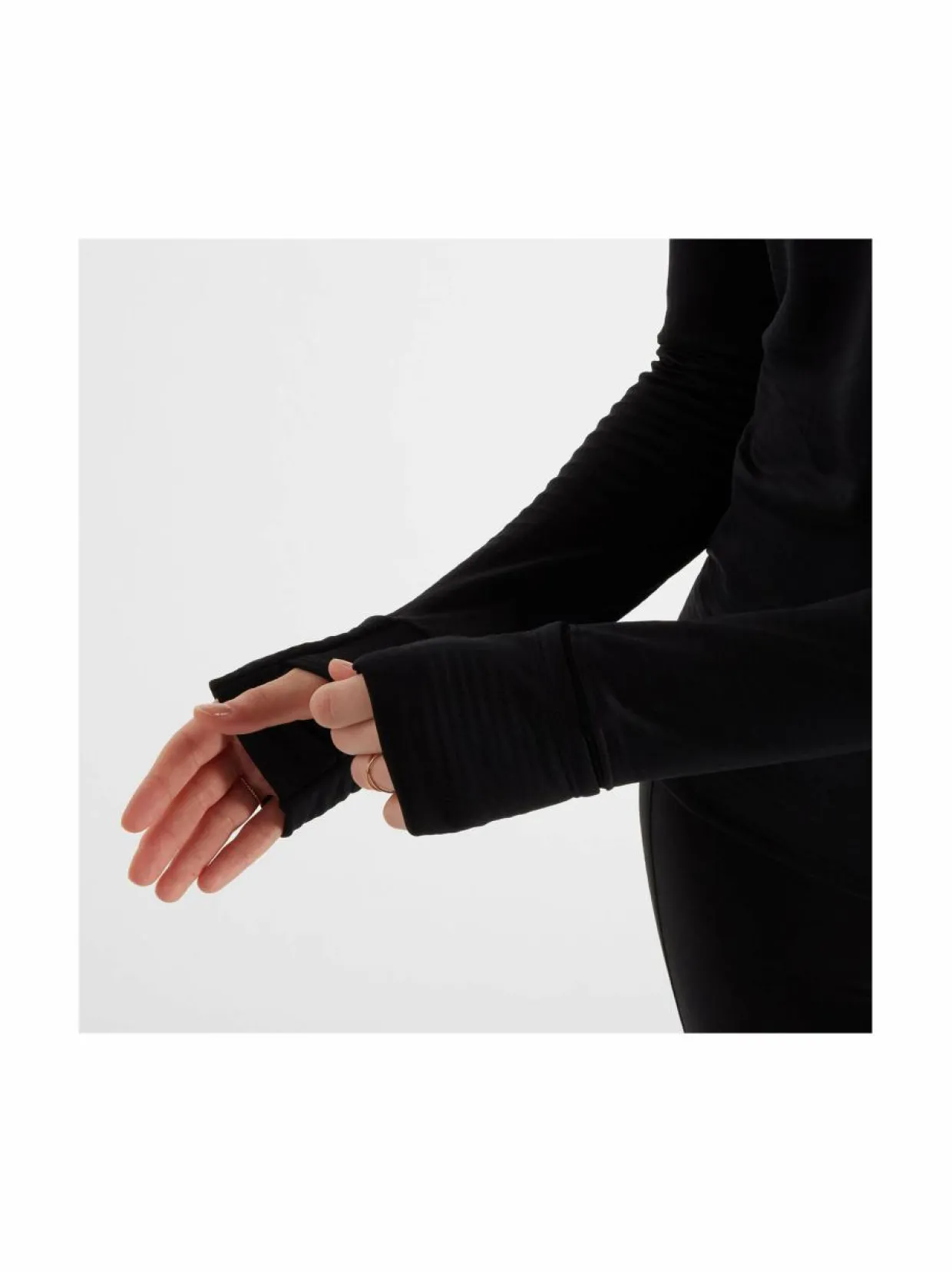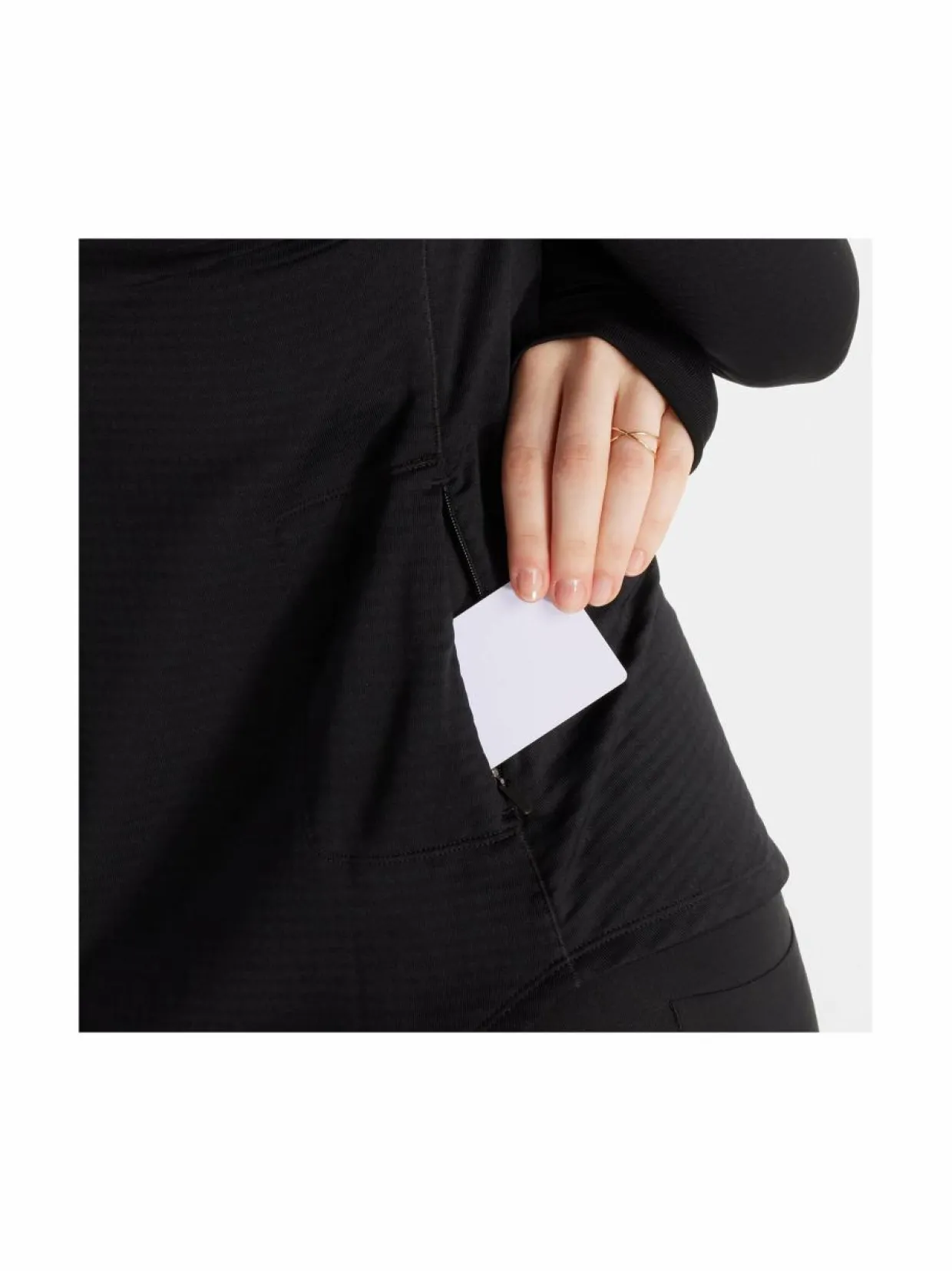 Naisten pitkähihainen paita, jossa on korkea kaulus ja puolivetoketju. Lämmin, harjattu fleecevuori auttaa sinua pysymään lämpimänä ja siirtää hyvin kosteutta pois iholta. Urheilullisen leikkauksen ansiosta paita istuu napakasti päälle. Paidassa on pitkät raglan-hihat peukalorei’illä ja kämmeniä lämmittävillä hihansuilla. Oikeassa kyljessä on pieni vetoketjullinen tasku, jossa kannat esimerkiksi kotiavaimesi turvallisesti mukana. Treenipaita on valmistettu kierrätysmateriaaleista.