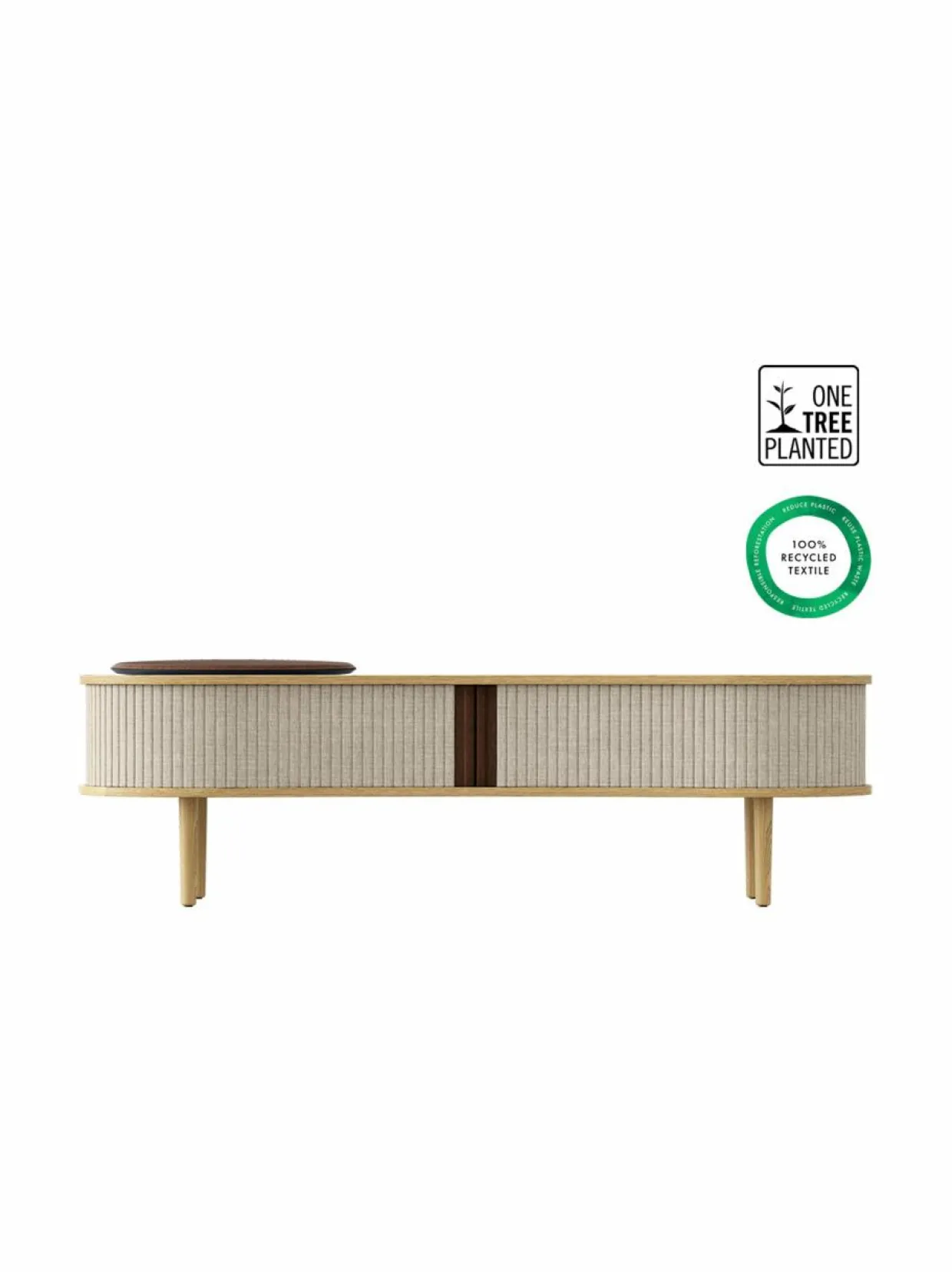 Tanskalaisen Jonas Søndergaardin suunnittelema Audacious TV-tasoa luonnehtivat sen pehmeä muotokieli ja funktionaalinen design. Se piilottaa itseensä siististi kaikki johdot – takana on reikä johtojen läpivientiä varten. Sen päällä voi myös istua, joten voit asettaa sen myös vaikkapa eteiseen ja istua sillä, kun puet kenkiä. Tasossa on rullaovet, jotka liukuvat päätyjen yli niitä siirrettäessä. Voit määritellä mielesi mukaan, kuinka paljon tason sisustaa on kerralla näkyvissä, siirrellen ovia.