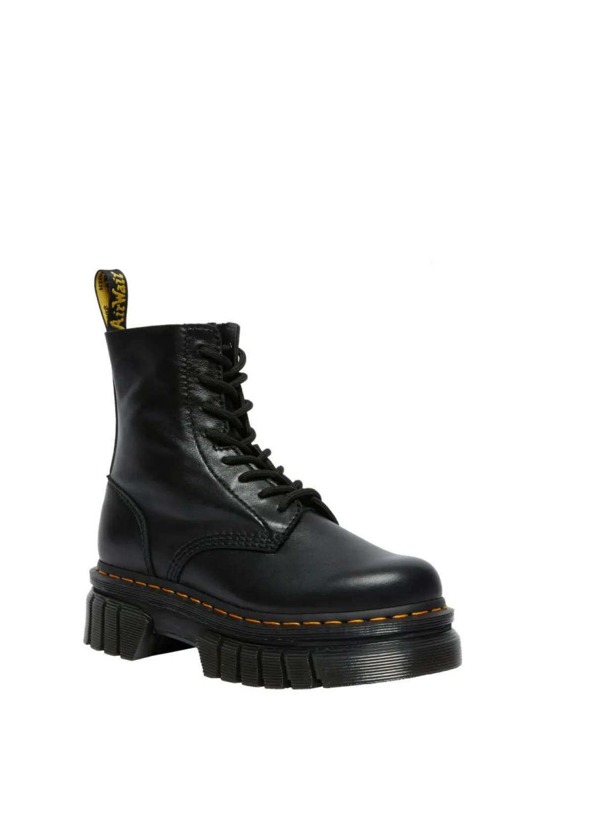 Korkealle kohoava platform-pohja. Arkikäyttöön. Nämä uudet, kevyen rakenteen omaavat maiharit istuvat paksun Quad-pohjan päällä. Jalkineissa on innovatiivinen kaksiosainen pohja – kevyt EVA-keskipohja ja PVC-ulkopohja, jossa on särmikkään syvät kiinnikkeet. Vähemmän painoa, enemmän asennetta. DM:t täydellä volyymilla. Maiharit on pakattu täyteen Dr. Martensin DNA:ta. Ne on viimeistelty DMS-kuvioinnilla, keltaisella pohjatikkauksella ja kirjaillulla AirWair-kantapäälenkillä.