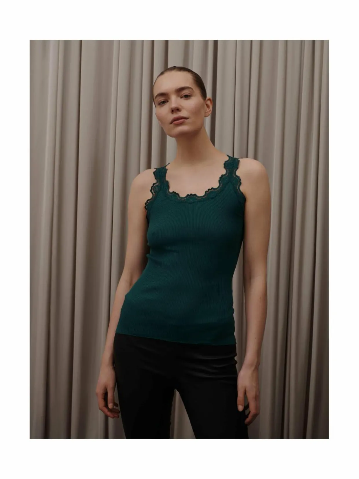 Rosemunden ylellisen pehmeän tuntuinen silkki-puuvillatoppi. Ribbipaita myötäilee kauniisti vartaloa. Yksityiskohtana aaltoileva helma sekä pitsireunus. Vaate sopii hyvin käyttöön sellaisenaan tai kerrospukeutumiseen.