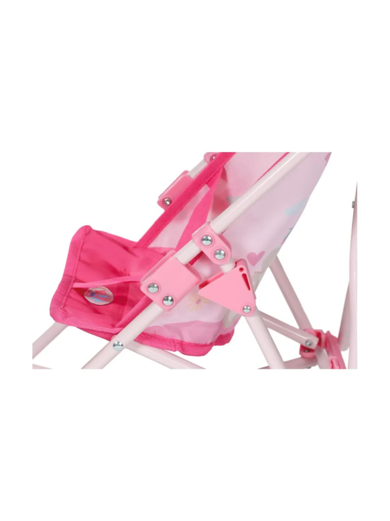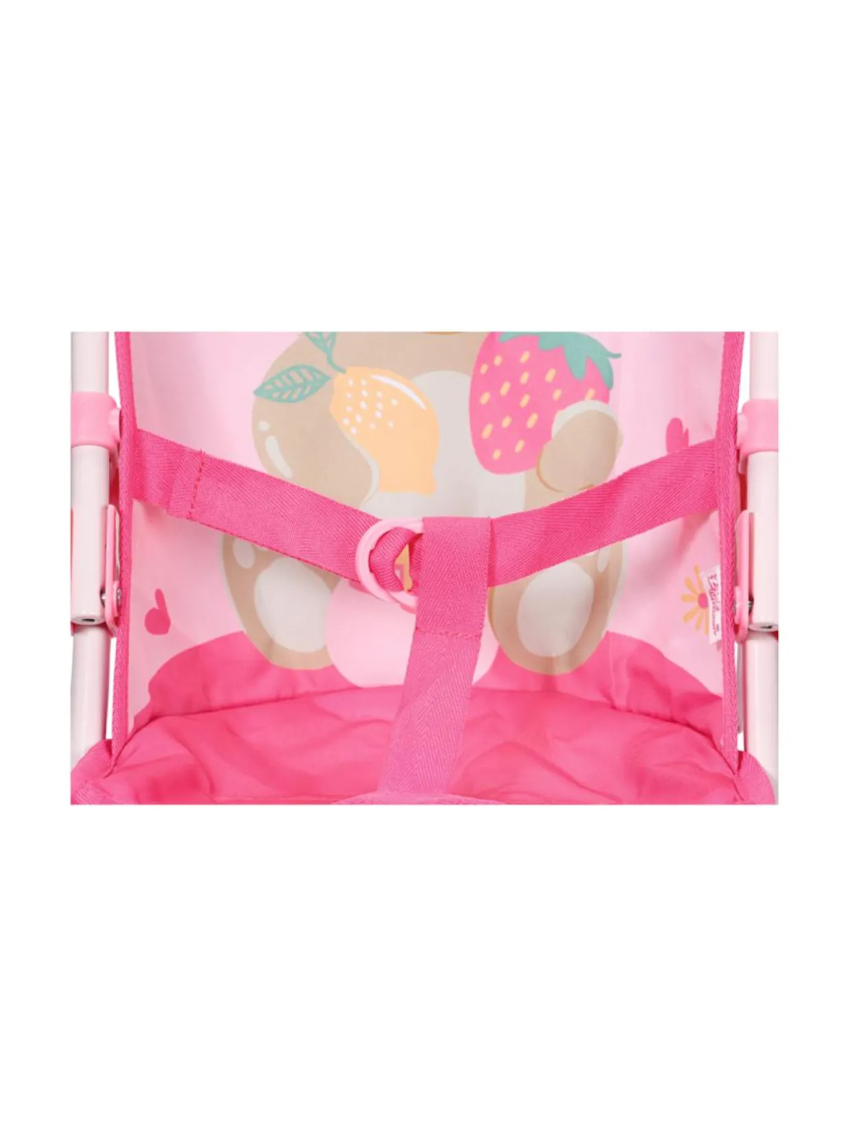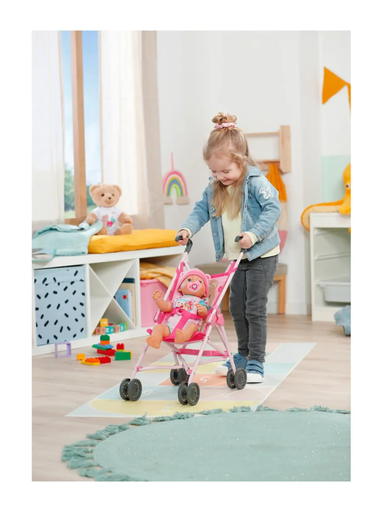 Näiden vaunujen kanssa on ihana lähteä vaunulenkille. Rattaan runko ja istuin ovat vaaleanpunaiset, mihin tummanharmaat työntökahvat, pyörät ja putket antavat täydellisen kontrastin. Turvahihnat pitävät Baby Bornin turvallisesti paikallaan istuimellaan. Berta-ankka on aina valmiina ajelulle, ja se onkin aivan Baby Bornin takana pitämässä hänelle seuraa. Illalla rattaat voi taittaa kokoon ja säilyttää helposti kompaktin kokonsa ansiosta. Rattaat sopivat 36 ja 43 cm:n kokoisille nukeille.
