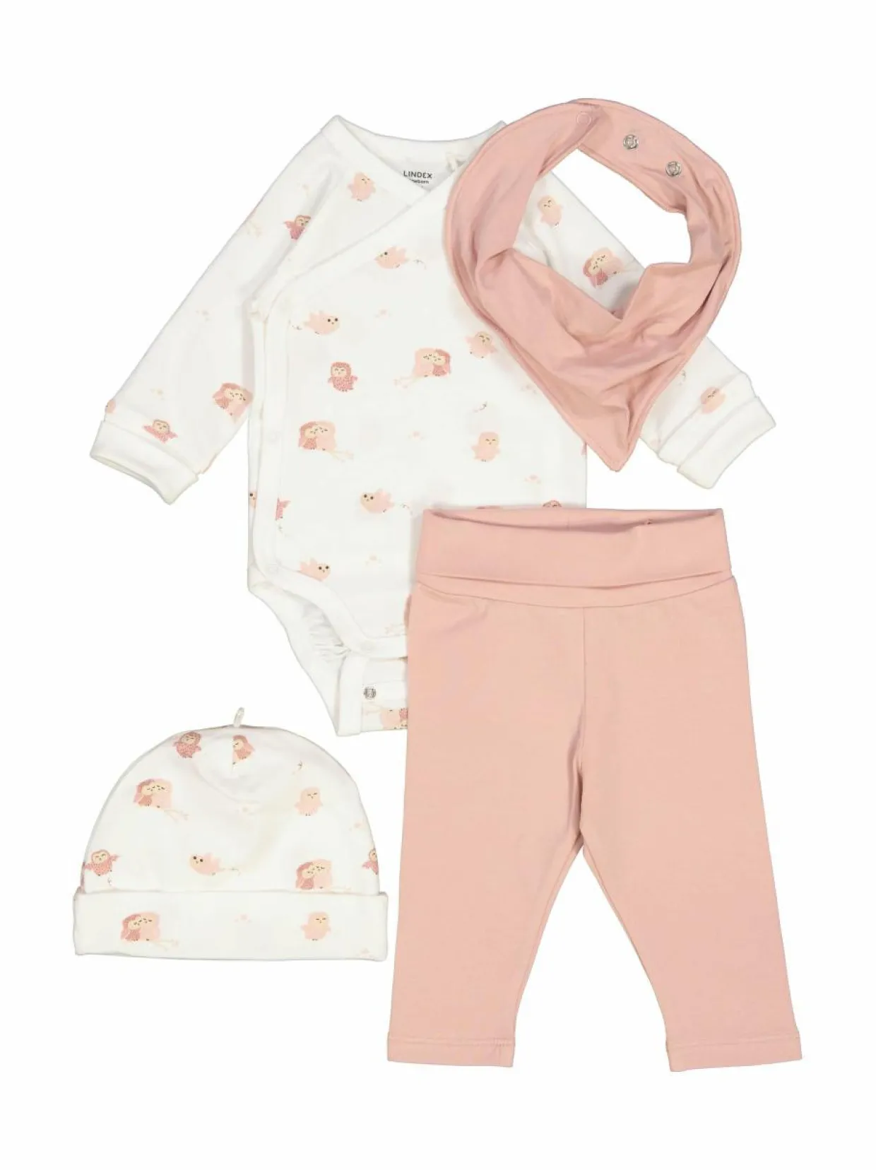 Lindexin pehmeä ja yhteensopiva vauvan aloituspakkaus sisältää leggingsit, pitkähihaisen kietaisubody, ruokalapun ja trikoopipon. Valmistettu pehmeästä luomupuuvillasta, joka on ihanteellinen vauvan herkälle iholle. Setin avulla voit luoda helposti suloisia asukokonaisuuksia pienokaisellesi. Erinomainen valinta myös lahjaksi. Jatkettavan koon ansiosta vaatteet sopivat vauvalle pidempään.
