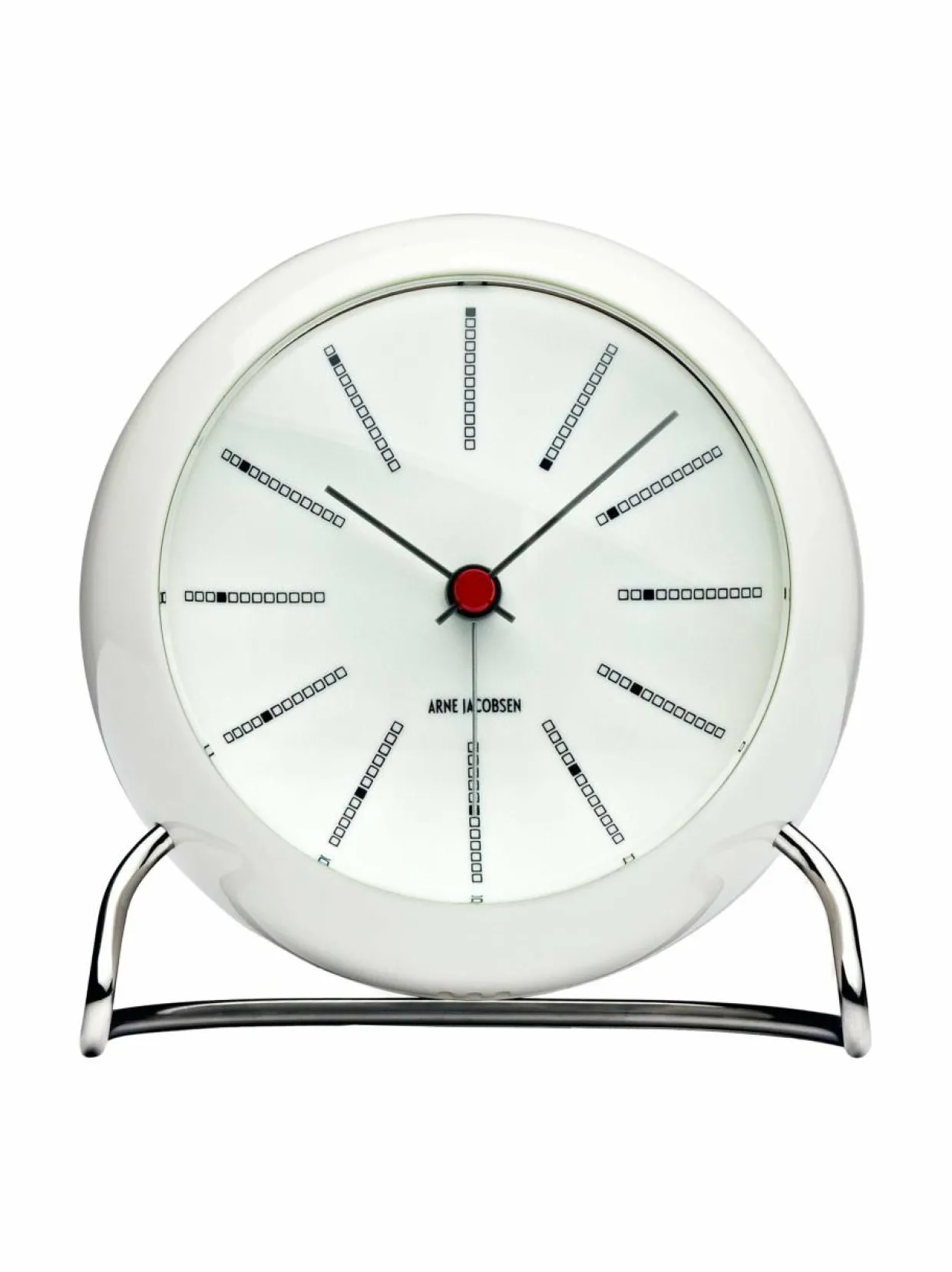 Arne Jacobsenin suunnittelema tyylikäs herätyskello toimii kahdella AA-paristolla. Halkaisija 110 mm.