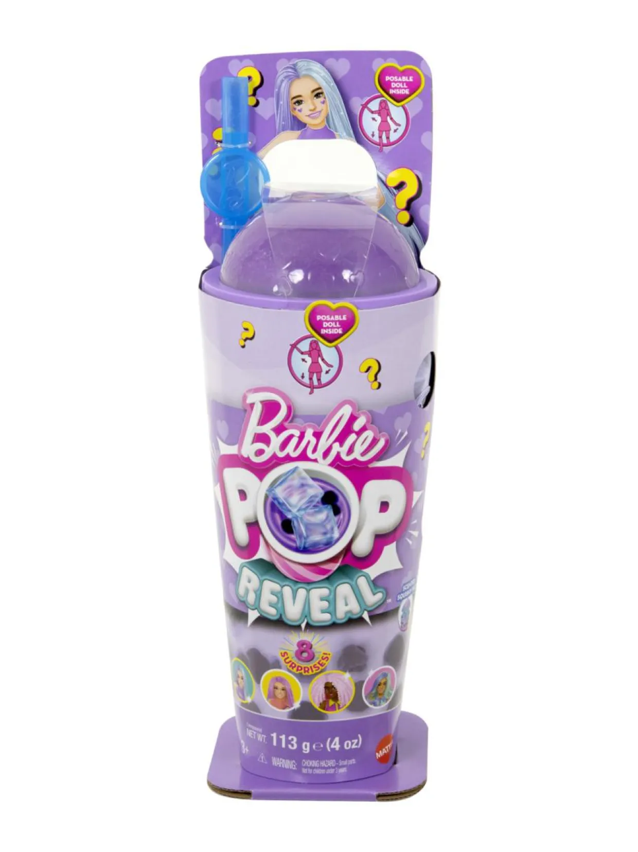 Barbie Pop Reveal kuplateen tuoksuiset yllätysnuket tarjoavat jännittävän pakkauksen avaamiskokemuksen ja kahdeksan yllätystä! Kierrä limalla täytetty korkki irti ja työnnä pilli kalvon läpi. Avaa kuppi ja löydä kuplateen tuoksuinen Barbie-nukke ja kahdeksan muuta yllätystä! Minkä nuken saat? Valikoimasta löytyy Taro-maitotee, Marjatee, Vihreä tee ja Mangotee, joista jokaisella on ainutlaatuinen tuoksunsa. Löydät myös kaksi uudelleenkäytettävää jääkuutiota, joista löydät hameen ja kengät. Sokkopakkauksista löytyy tarvikkeita ja lemmikki. Barbien kasvoilla on väriyllätysefekti, joka ilmenee kuuman ja kylmän veden vaihtelulla. Ikäsuositus 4+