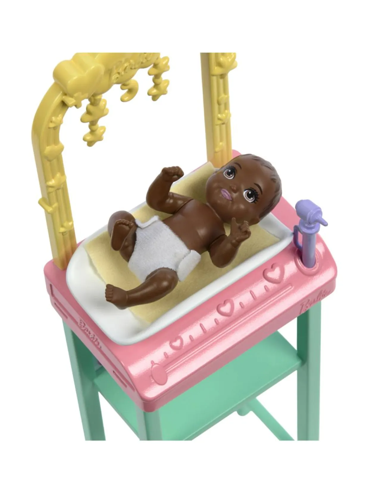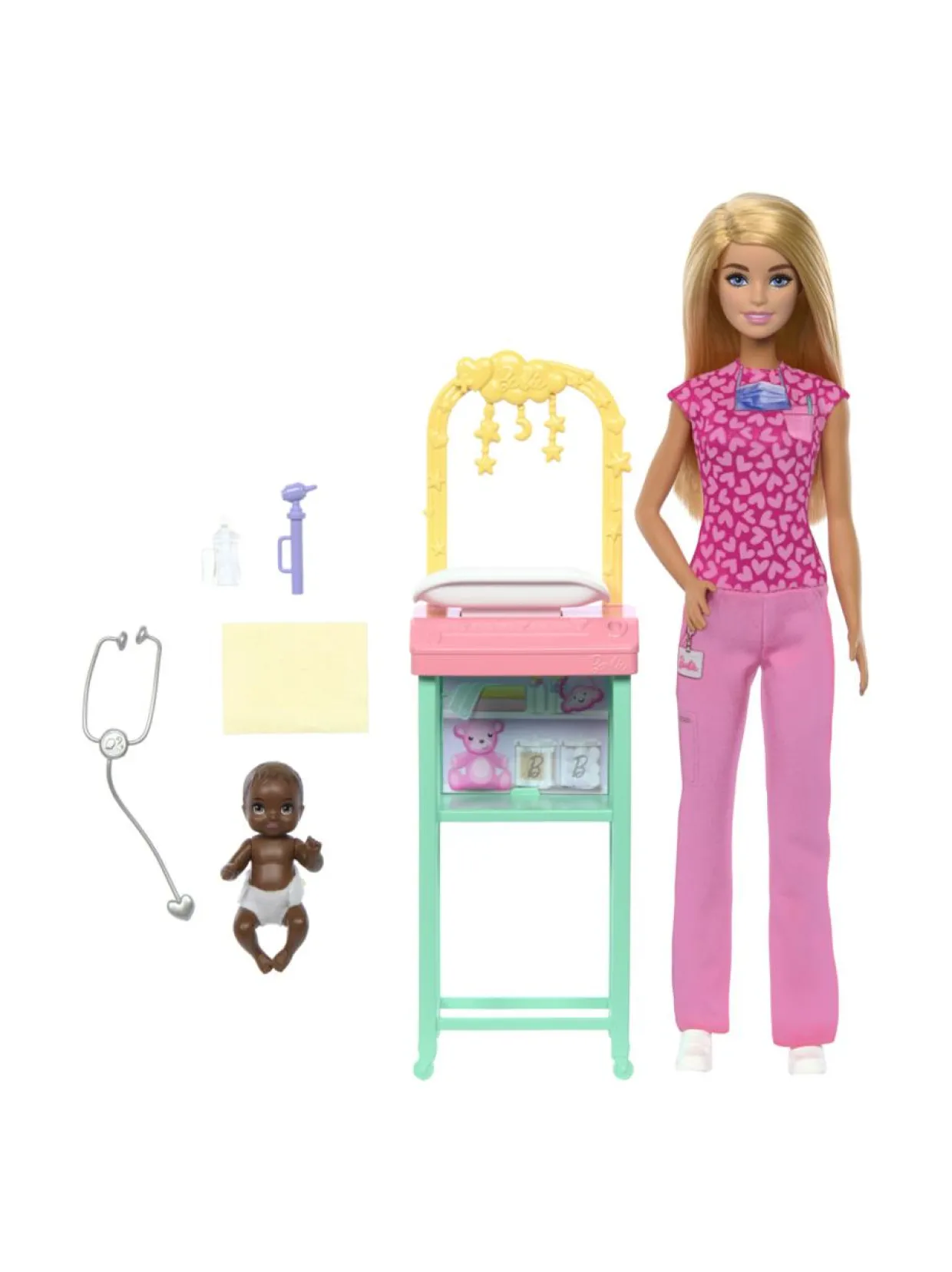 Söpö ja leikkisä nukkesetti, joka tutustuttaa lapset terveydenhuollon maailmaan. Setti sisältää vaaleatukkaisen Barbie-lääkärinuken, jolla on vaaleanpunainen lääkärin asu. Settiin kuuluu myös pieni vauvanukke vauvan tarvikkeineen ja huonekaluineen. Ikäsuositus 3+