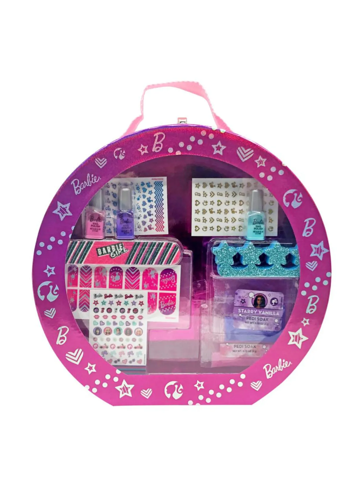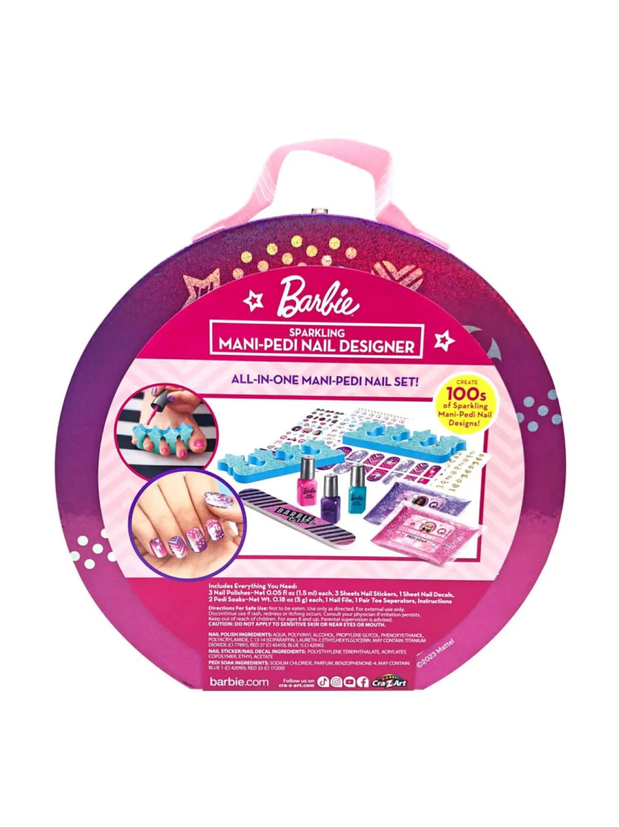 Ole oma kynsitaiteilijasi Barbien™ kaksi yhdessä manikyyri ja pedikyyrisetin avulla. Setti sisältää todella trendikkäitä muotikynsilakkoja, varpaanerottimia, tuoksuvaa jalkakylpyainetta, eri muotoisia paljetteja, kimalletta, kimaltelevan kynsiviilan, timantteja, kynsitarroja ja paljon muuta! Säilytä kaikki tarvikkeet salkun sisällä! Täydellinen matkalla tehtävään manikyyriin tai pedikyyriin!