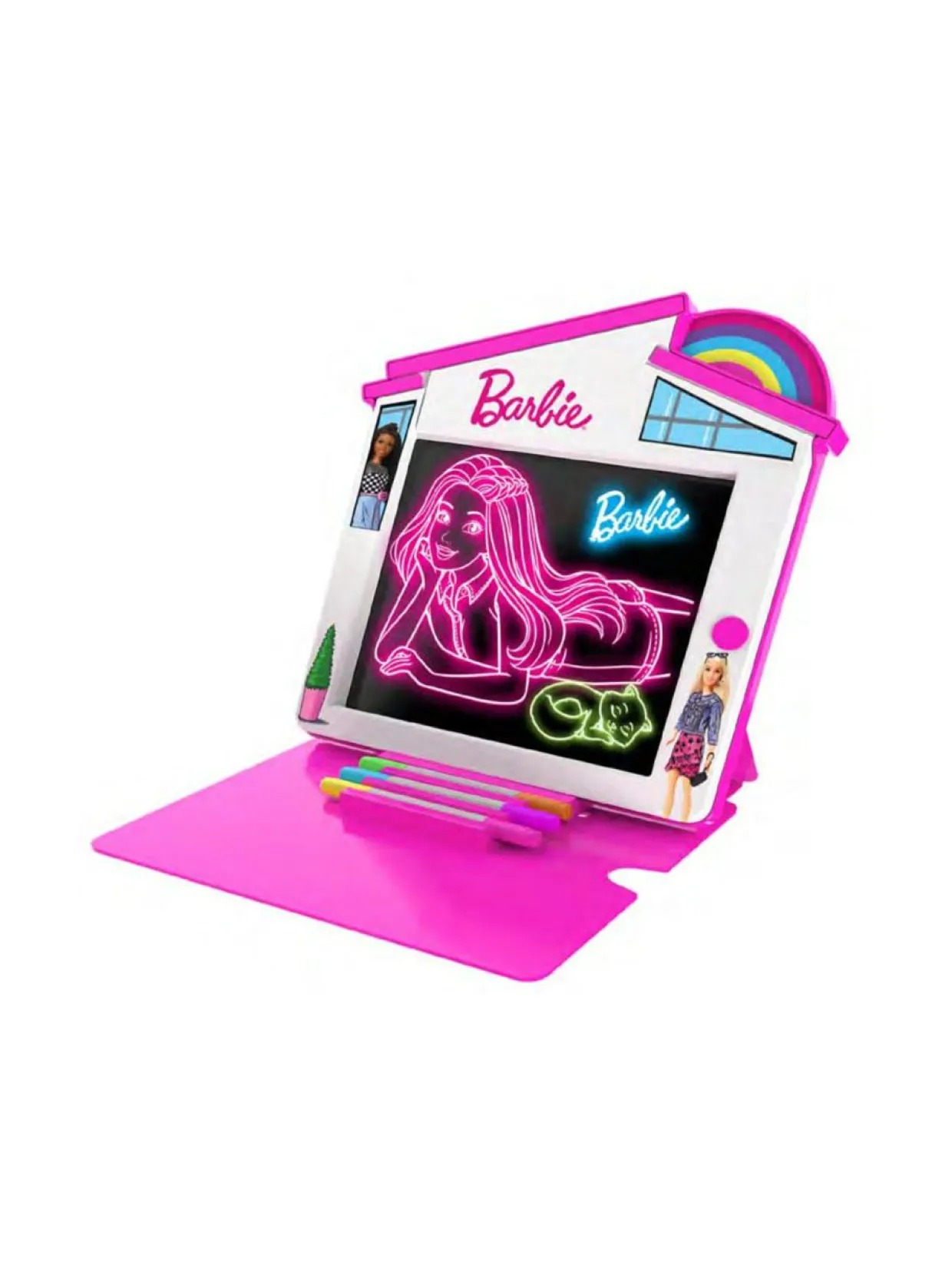 Barbie Valopaneeli. Kolme eri asentoa – 8 vaihtuvaa LED-valoa värikkäillä tehosteilla. 3 pyyhittävää laadukasta tussia – Valkoinen tausta valkoiselle pohjalle. Musta tausta mustalle pohjalle – Läpinäkyvä paneeli piirrosten ja esineiden jäljentämiseen. Mahdollistaa vapaalla kädellä piirtämisen. Automaattinen sammutus – Jäljennä mikä tahansa piirros. Kopioi mikä tahansa esine kotona. Musta tausta 8 erilaista neonvalotehostetta varten. Kestävä taustalevy, jota voi käyttää myös tukena. Ikäsuositus: 3+.