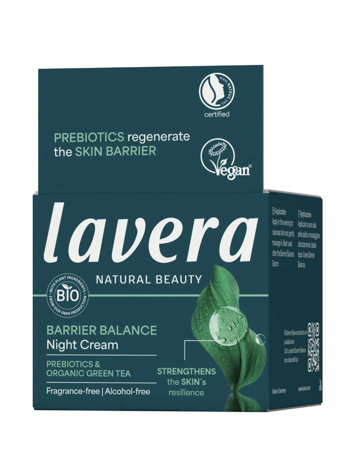 Lavera Barrier Balance Night Cream -voide on prebiootteja ja vihreää teetä sisältävä yövoide, joka kosteuttaa ihoa, suojaa ja vahvistaa ihon suojakerrosta ja tukee ihon mikrobiomia. Hajusteeton koostumus sopii herkälle iholle. Levitä puhdistetulle iholle illalla.