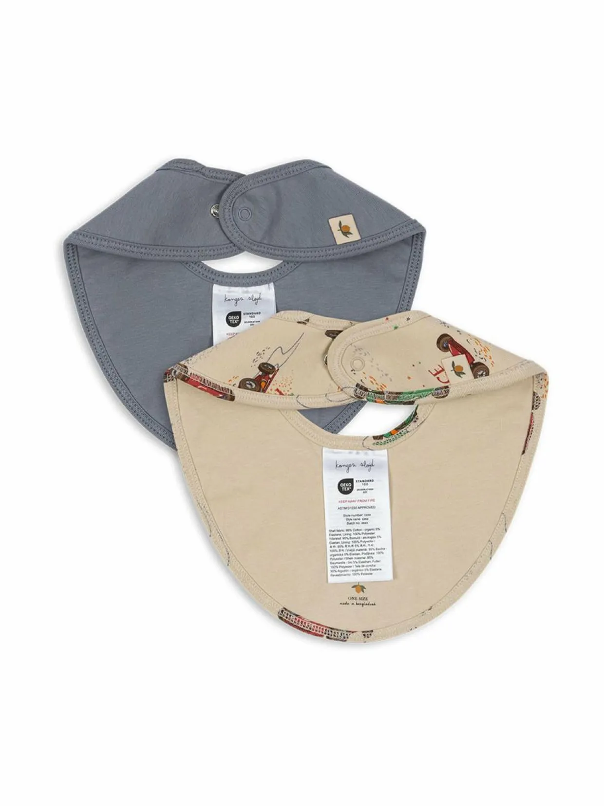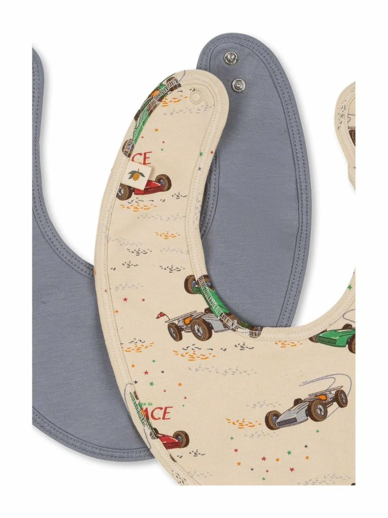 Konges Sløjd merkin ruokalaput, joissa on kaksi painonapitettua säätötasoa. Valmistettu pehmeästä ja ihoystävällisestä luomupuuvillasta. Pakkauksessa on kaksi ruokalappua, josta toinen on yksivärinen ja toisessa on printti.