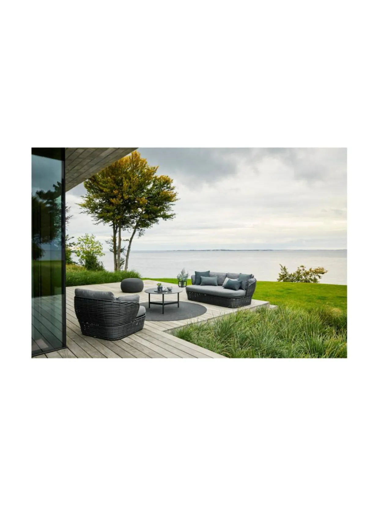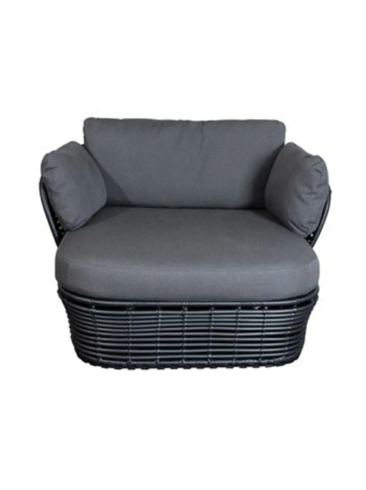 Basket-nojatuoli ulkokäyttöön. 110 cm lev, 100 syv, 70 kork, 40 istuinkork. Muhkea ja mukava Cane-Line Air Touch harmaa tyynysetti sisältyy hintaan. Grafiitin värinen Cane-line Weave® -punosmateriaali, pulverimaalattu teräsrunko.