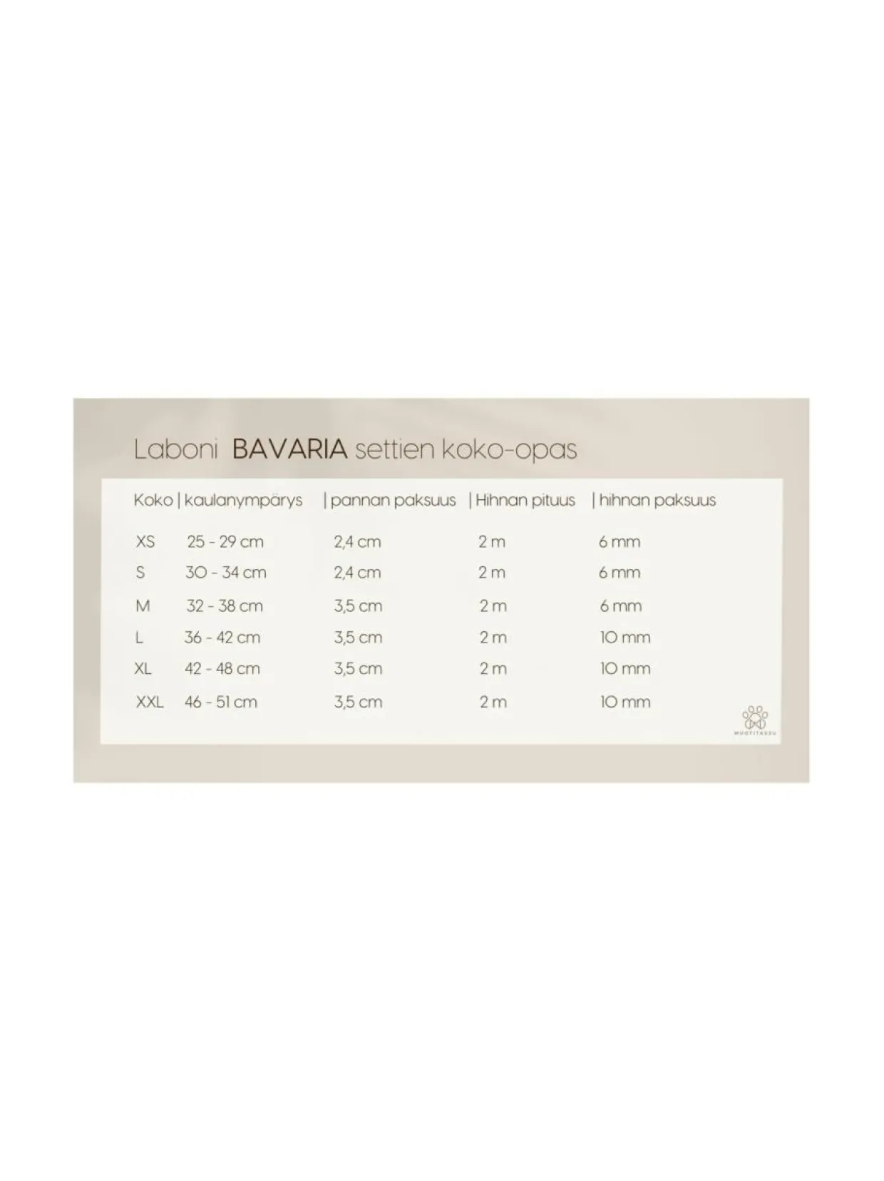 Hihnan pituus on 2 metriä. XS, S ja M seteissä hihnan paksuus on 6 mm. L, XL ja XXL seteissä hihnan paksuus on 10 mm.