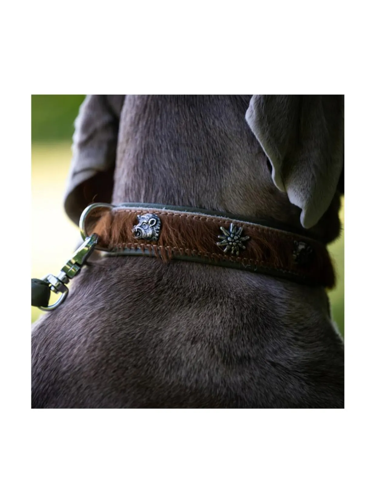 Tämä taidokkaasti käsintehty, erityisen pehmeästä nappanahkasta sekä koristeellisesta lehmännahkasta valmistettu Bavaria kaulapanta ja talutushihna antavat parhaan käyttömukavuuden sekä sinulle että koirallesi. Pannassa on täydelliset saumat, laadukkaat kiinnikkeet sekä kiinteä karbiini takaamassa turvallisuutta. Pyöreä, ommeltu, 3-suuntaisesti säädettävä talutushihna tarjoaa erityisen pehmeän tunteen taluttaessa. Vahvan ompelun lisäksi hihnan ydin on vahvistettu nailonilla lisäämään kestävyyttä. Kaulaa vasten olevan alapuolen samettisen pehmeä nupukkinahka sopii hyvin myös herkille koirille.