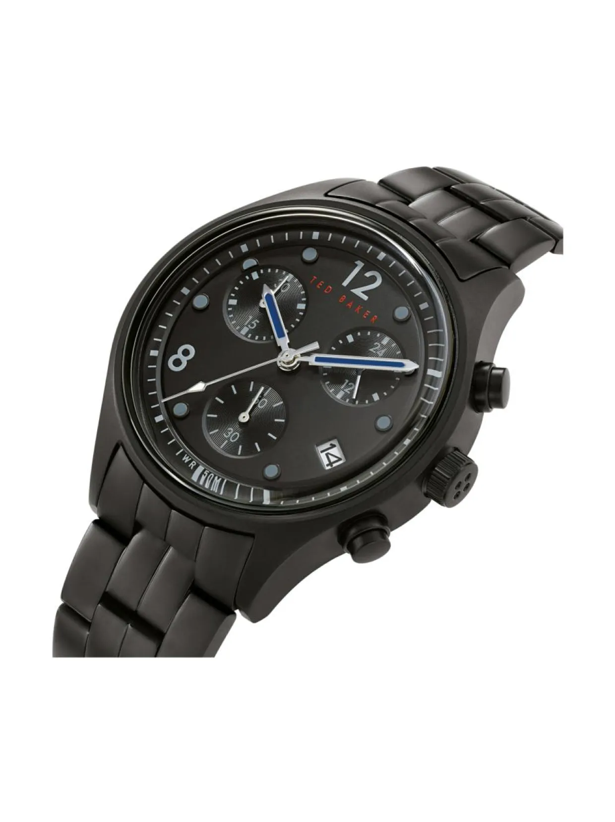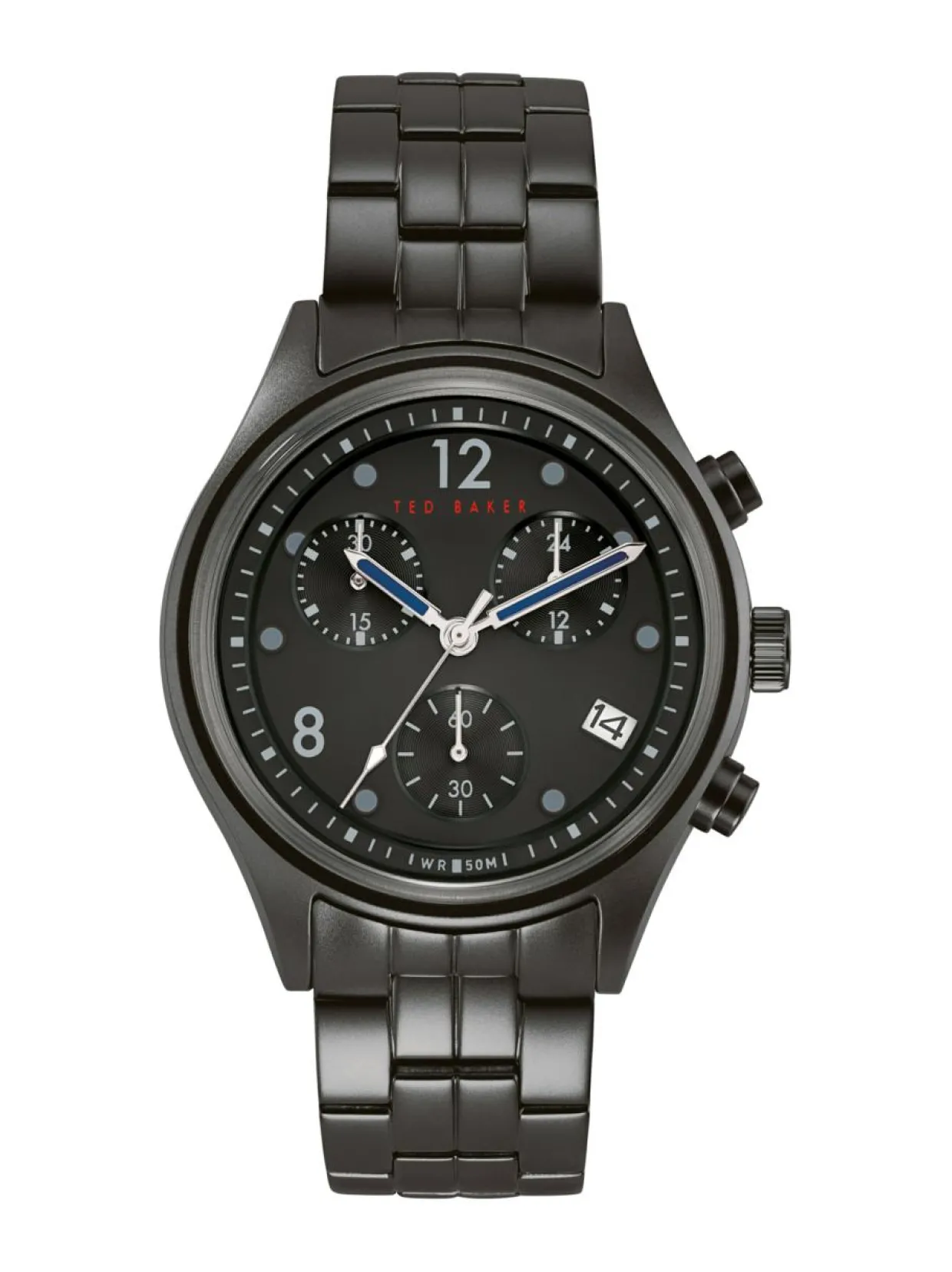 Ted Baker Beleeni 42mm chrono tuo sporttisen lisän asukokonaisuuteen. Kellon musta runko on valmistettu ruostumattomasta teräksestä. Sen leveys on 42mm ja paksuus on 11,5mm. Kellon musta metalliranneke on ruostumatonta terästä. Kellossa on musta taulu ja luminoidut viisarit. Taulua suojaa mineraalilasi. Kellossa on VR34-kvartsikoneisto ja sen vesitiiviys on 5ATM. Ted Baker kelloilla on 2 vuoden takuu.