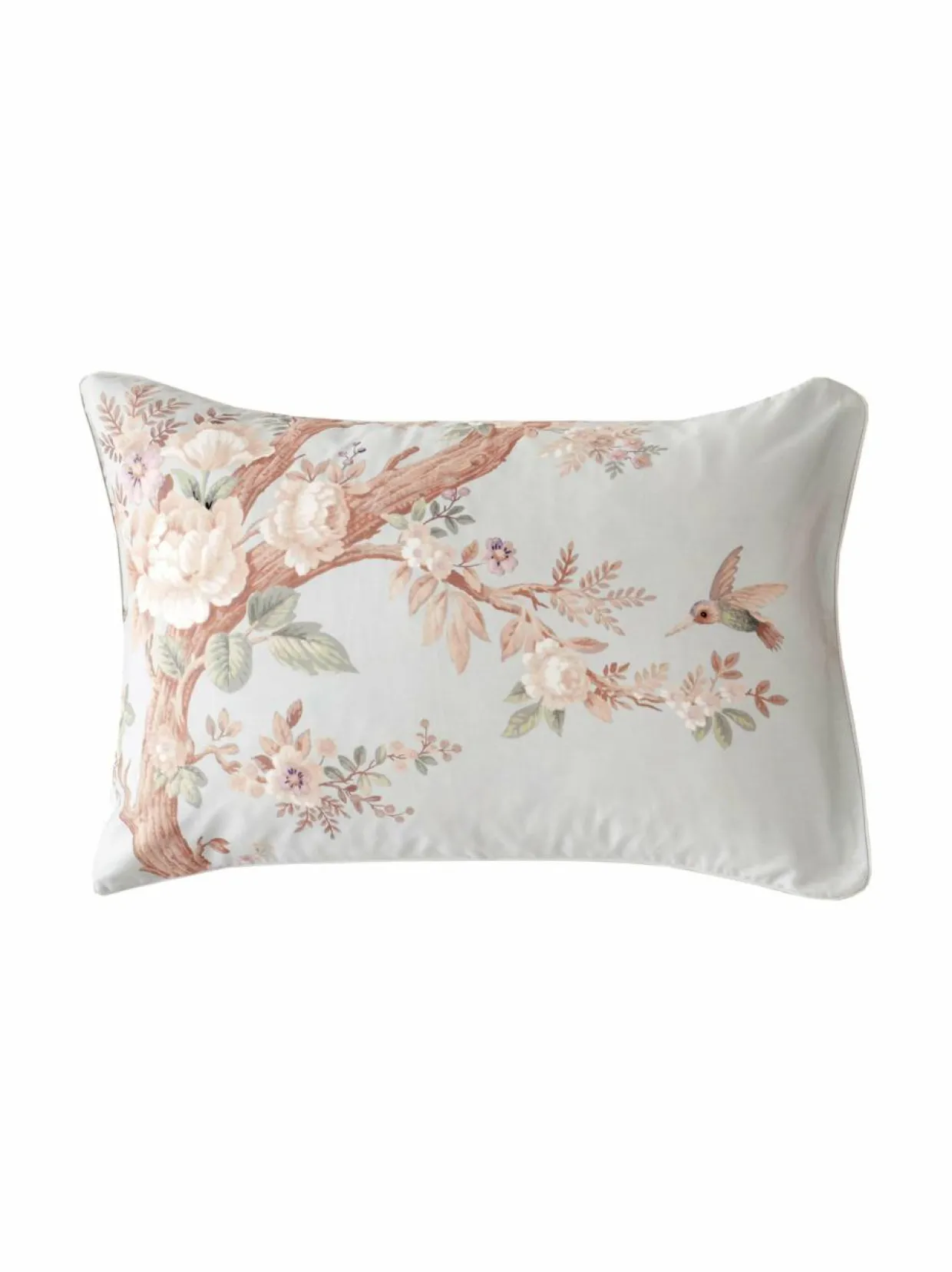 Elegantit kolibrit ja kauniit kukat somistavat Laura Ashleyn Belvedere-tyynyliinaa. Materiaali on ylellistä puuvillasatiinia.