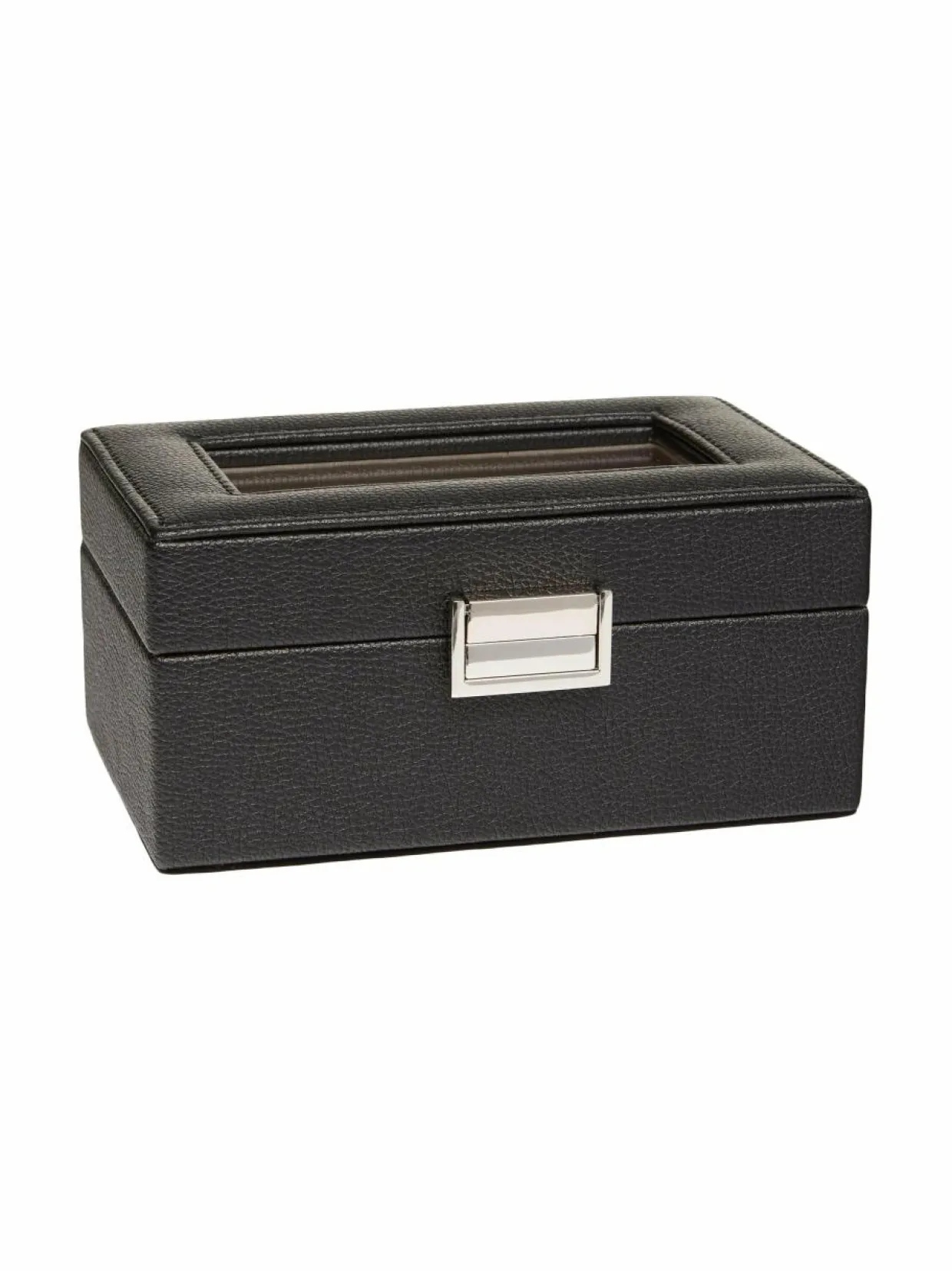 Kätevä pienikokoinen kellorasio, jossa pehmeä pehmustettu tekonahkainen ulkopinta, kevyt samettinen sisäpuoli ja läpinäkyvä kansi kokoelman katselemiseksi laatikon ollessa suljettuna. Rasiassa on tilaa kolmelle kellolle.