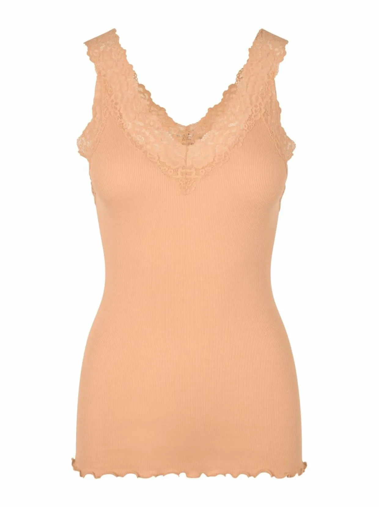 V-kauluksellinen mukava ja joustava toppi, joka mukautuu vartalon muotoon. Yläosaa koristavat pitsisomisteet, ja helma on kauniisti aaltoileva. Valmistettu ihoystävällisestä luomupuuvillasta.