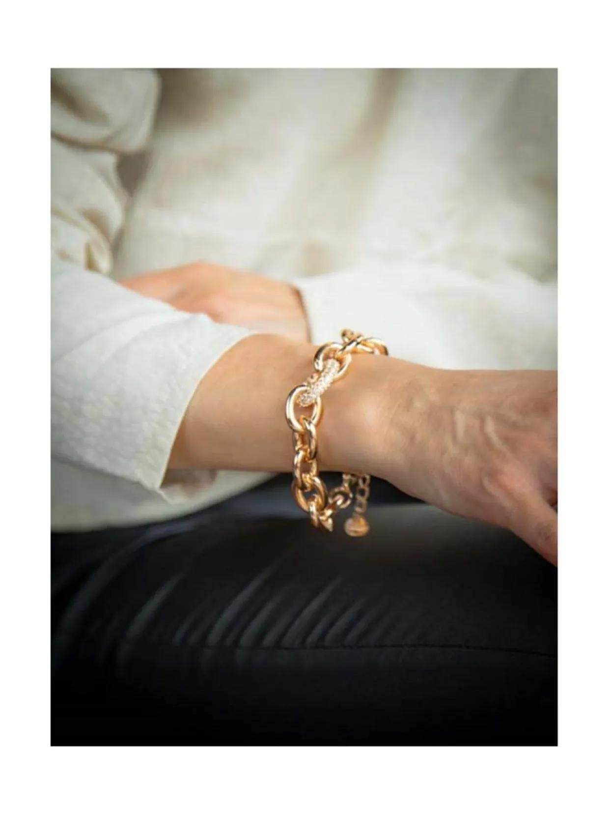Paksu 18K kullattu rannekoru, jossa keskellä oleva keskilenkki on täynnä kimaltelevia lasikiteitä. Pituus on 18 cm ja siinä on pieni lisäketju, joka on 3,5 cm, joten voit säätää pituutta käsivarteen mukaan. Keskellä olevan kidetäytteisen lenkin leveys on 19 mm ja loput lenkit 15 mm. Nikkeliturvallinen.