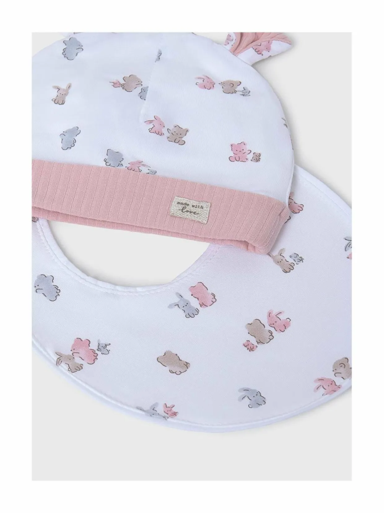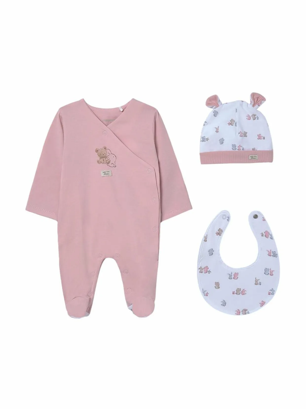 Ihastuttava lahjapakkaus, jossa pitkähihainen body, trikoopipo ja sylkiessun. Asukokonaisuus on vimeistelty karhun ja pupun kuvioilla ja tämä kokonaisuus sopii erityisesti lahjaksi. Body on kietaisumallinen ja siinä on painonappikiinnitys ja se on helppo pukea ja riisua. Pipo on valmistettu pehmeästä materiaalista ja se on joustava sekä mukava käyttää. Sylkiessu on valmistettu pehmeästä materiaalista ja se on helppo puhdistaa.