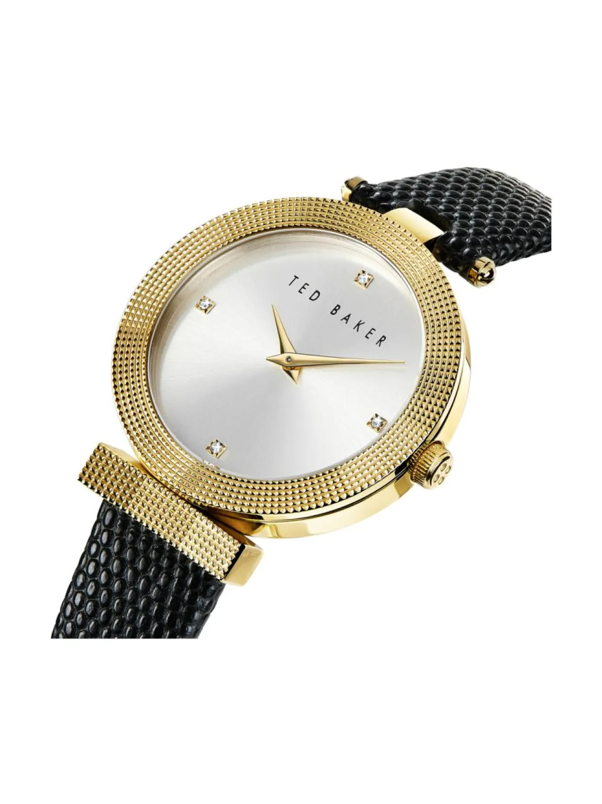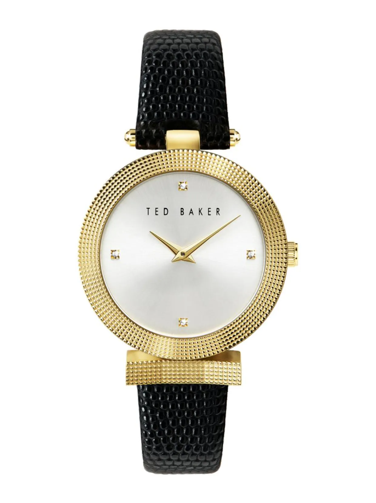 Ted Baker Bow-mallisto on naisellisia yksityiskohtia täynnä. Neljännestuntien kohdalla on swarovski-kristallit ja rungon alaosassa on Tedille tunnusomainen rusettimuotoilu. Liskokuvioinen nahkaranneke täydentää kellon selkeän ilmeen. Kellon kullanvärinen runko on valmistettu ruostumattomasta teräksestä ja sen leveys on 36mm ja paksuus on 8mm. Kellon taulu on hopeanvärinen, kellossa on mineraalilasi ja Y120E-kvartsikoneisto. Kellon vesitiiviys on 5ATM. Ted Baker kelloilla on 2 vuoden takuu.