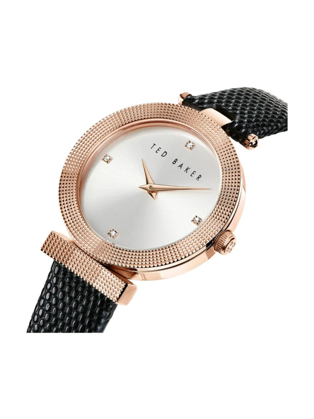 Ted Baker Bow-mallisto on naisellisia yksityiskohtia täynnä. Neljännestuntien kohdalla on swarovski-kristallit ja rungon alaosassa on Tedille tunnusomainen rusettimuotoilu. Liskokuvioinen nahkaranneke täydentää kellon selkeän ilmeen. Kellon ruusukullanvärinen runko on valmistettu ruostumattomasta teräksestä ja sen leveys on 36mm ja paksuus on 8mm. Kellon taulu on hopeanvärinen, kellossa on mineraalilasi ja Y120E-kvartsikoneisto. Kellon vesitiiviys on 5ATM. Ted Baker kelloilla on 2 vuoden takuu.