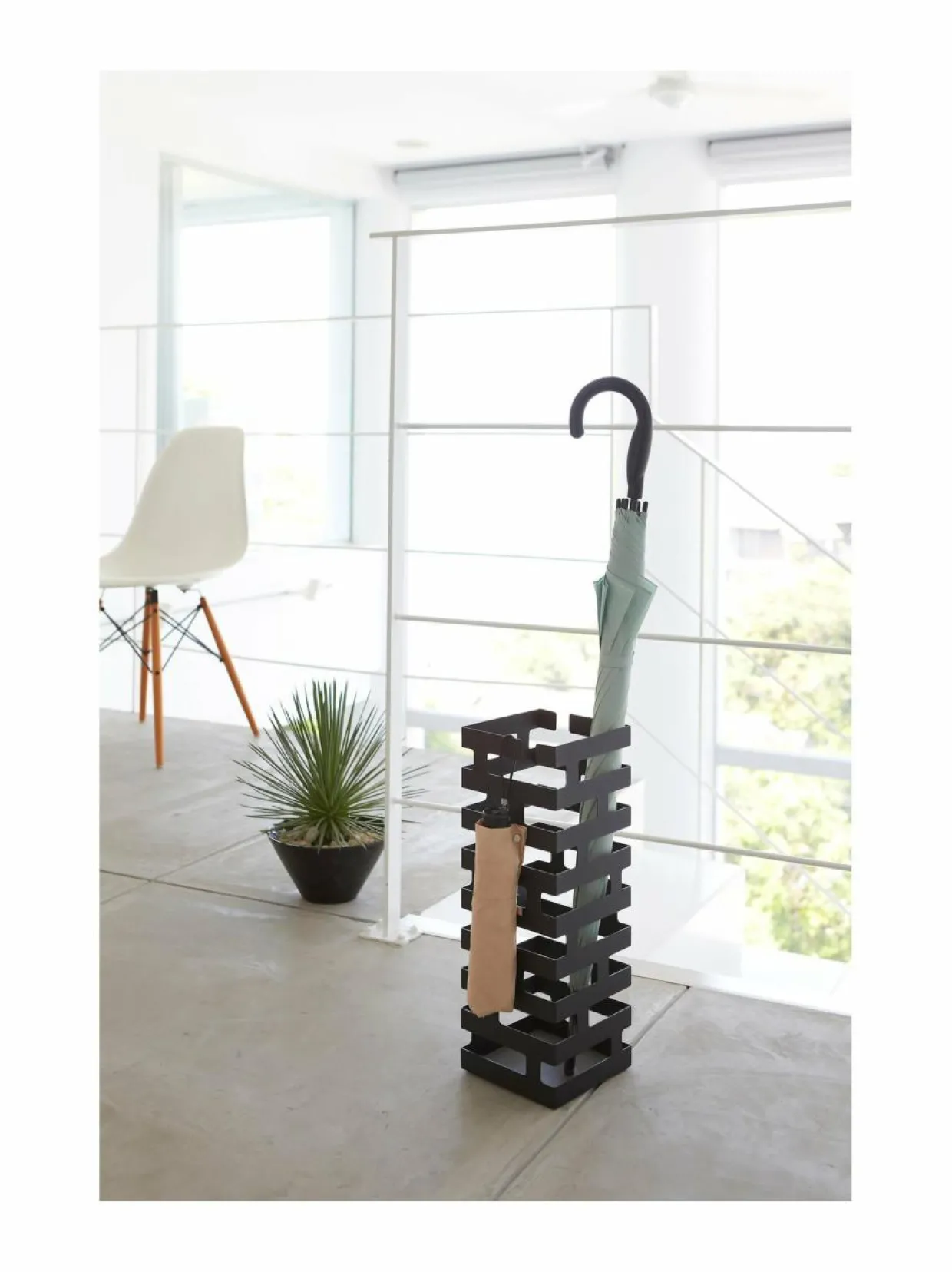 Yamazakin Brick-sateenvarjoteline vie vain vähän tilaa eteisessä, mutta siihen mahtuu jopa 8 sateenvarjoa. Teline on valmistettu mattapintaiseksi maalatusta teräksestä ja sen näyttävä mutta yksinkertainen design sopii monenlaiseen sisustukseen. Suunniteltu Japanissa.