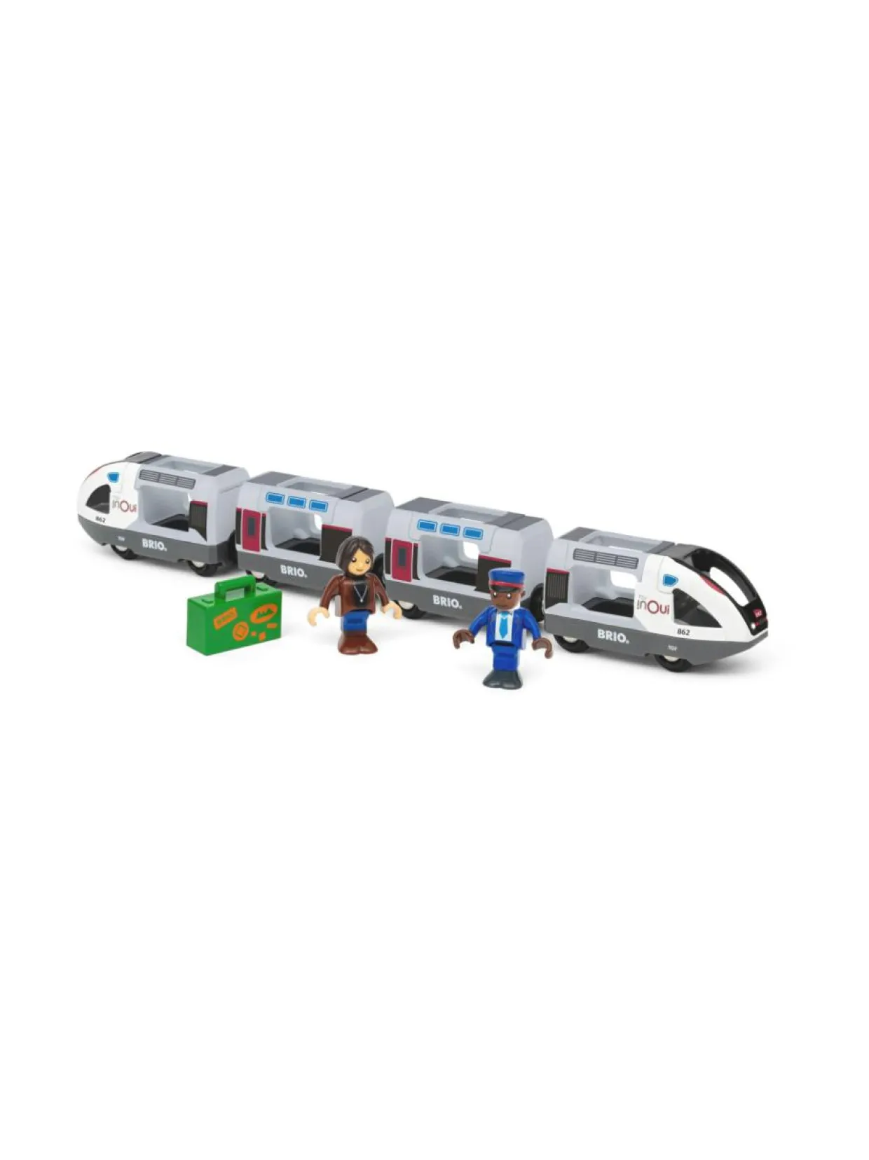 Matkusta romanttisesta Pariisista Ranskan Rivieralle TGV-suurnopeusjunalla (36087), joka on osa Maailman junat -sarjaa. Tarkasti oikeaa TGV:tä muistuttava suurnopeusjuna on BRIO Worldin pisin juna, jossa on tilaa 6 hahmolle. TGV-rautatie kattaa suuren osan Ranskasta, mutta kulkee myös moniin naapurimaihin, kuten Italiaan, Espanjaan ja Saksaan. Tutustu ikonisiin rautatiereitteihin ja kuuluisiin juniin kaikkialta maailmasta Maailman junat -sarjan avulla. Tietoa BRIO World -maailmasta: BRIO World on avoin leikkisarja, joka kasvaa lapsesi mukana. Kaikki BRIO World -lelut ovat yhteensopivia keskenään, ja niiden avulla lapsi voi haastaa itseään kasvaessaan. Mielikuvituksellisille leikeille on rajattomasti yhdistelmiä, ja tämä leikkijuna on luonnollinen osa sitä – valitse vain osa ja ala rakentaa omaa maailmaasi. 36087 Maailman junat TGV-suurnopeusjuna sisältää 7 osaa: 2 suurnopeusveturia, 2 matkustajavaunua, 2 BRIO World -hahmoa, 1 matkalaukku.