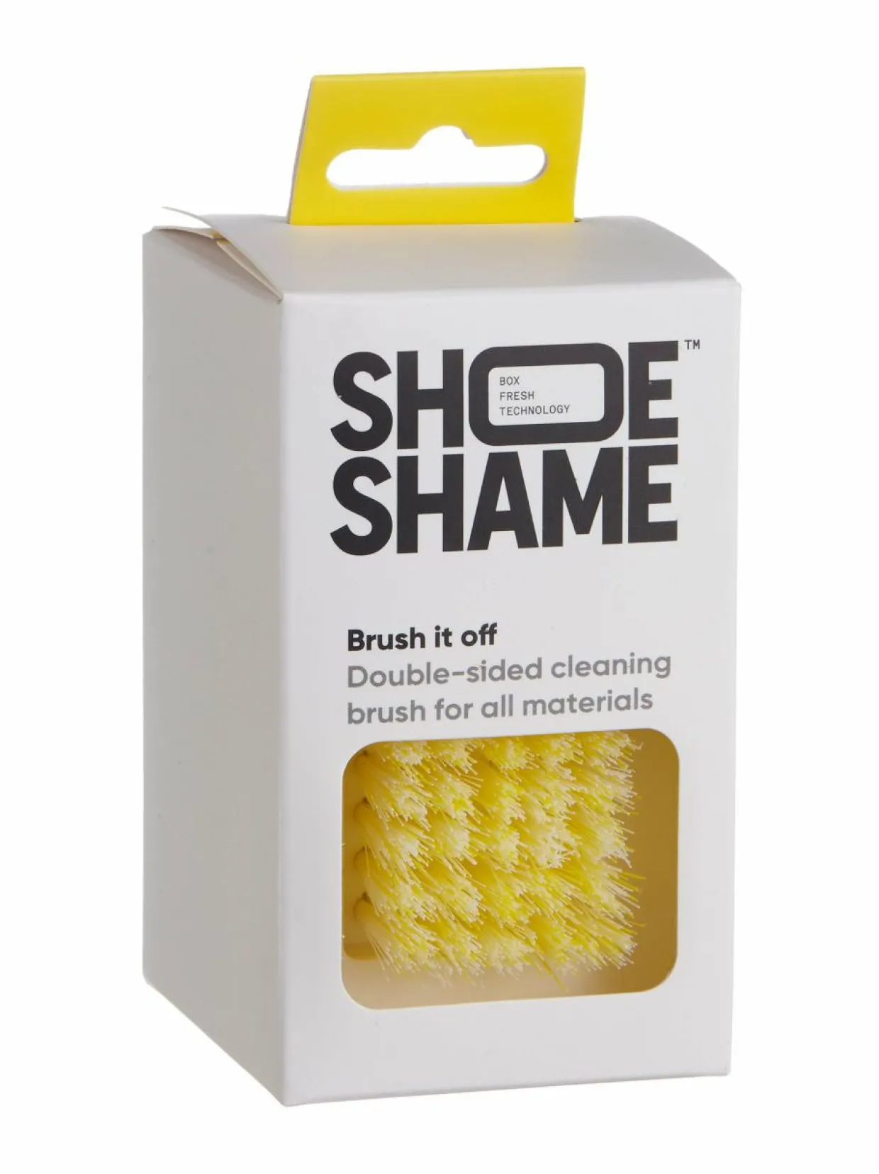 Shoe Shame Brush it Off -kenkäharja sopii kaikille materiaaleille. Harjassa on kaksi erilaista puolta, tiheämpi ja karheampi.