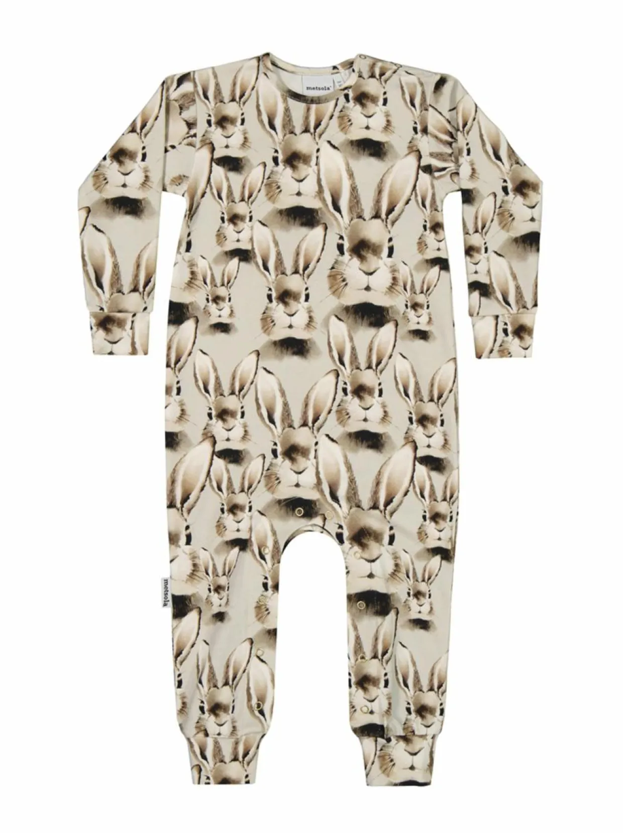 Pitkä haalari, jota somistaa pupukuovio. Kätevät nepparikiinnitykset kauluksessa ja haaraosassa. Joustavat resorit hihan- ja lahkeensuissa.