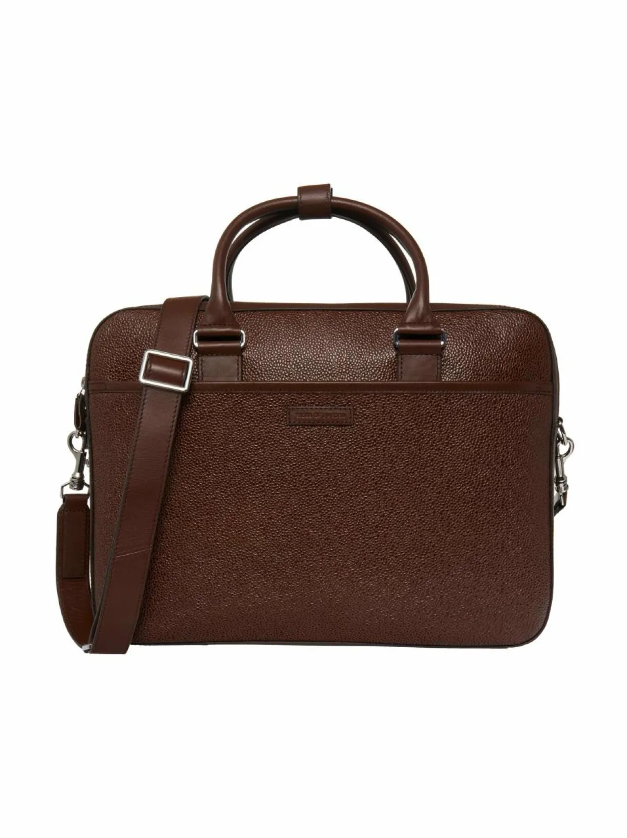 Hienorakenteisesta lehmännahasta valmistettu salkku Tiger of Sweden merkiltä. Laukussa on kaksi mukavaa kantokahvaa ja irrotettava olkahihna. Se suljetaan kahdella vetoketjulla. Sisältä löydät lisätaskun. Mitat: Pituus 40 cm, korkeus 29 cm ja syvyys 7,5 cm.