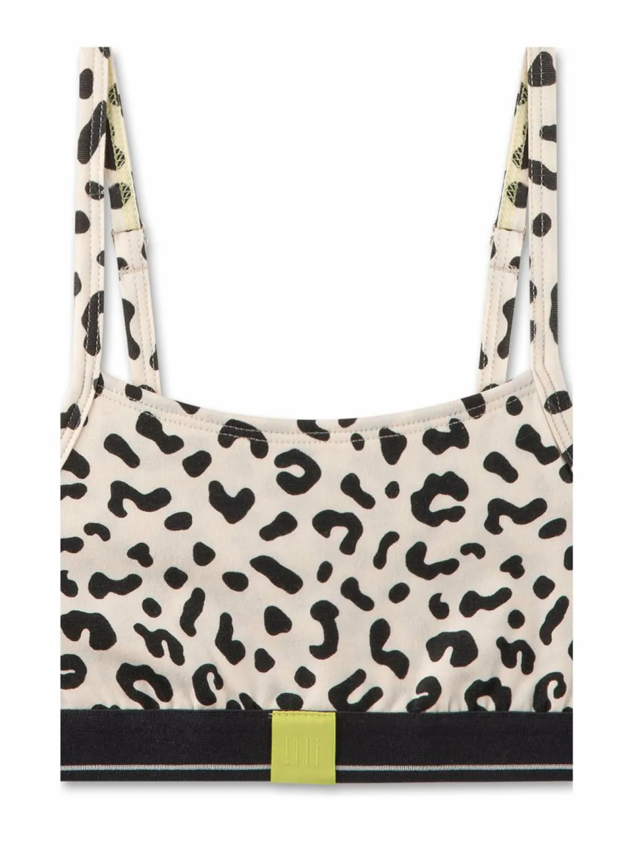Sanetta Bustier-alusasutoppi on mukava ja se on valmistettu pehmeästä ja hengittävästä materiaalista, joka tuntuu miellyttävältä iholla. Alustopissa on leveät olkaimet, jotka eivät paina olkapäitä ja siinä on leopardikuvio. Se on valmistettu 95 % puuvillasta ja 5 % elastaanista.