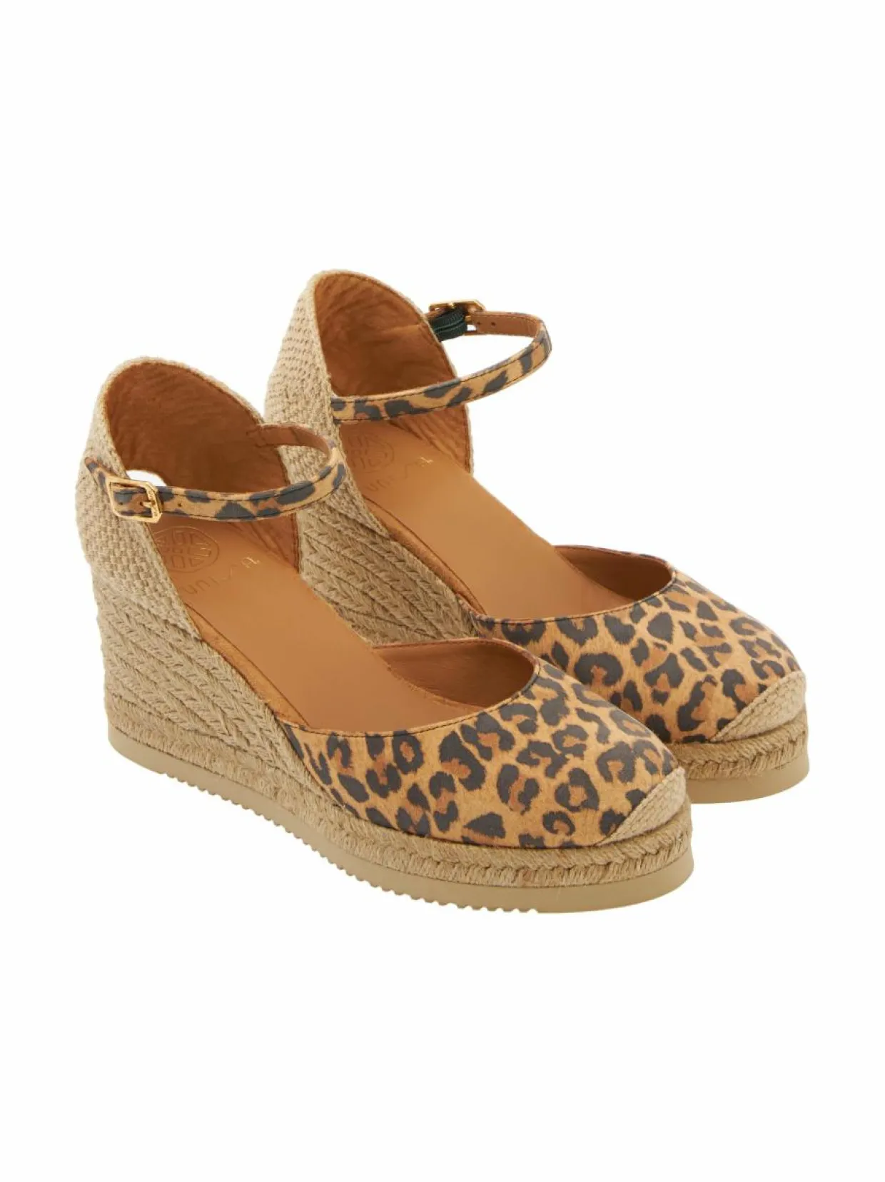 Näyttävät korkeakorkoiset espadrillot Unisa merkiltä. Yksityiskohtana leopardikuosinen nahkainen kärki, klassinen juuttipunos ja kapea säädettävä nilkkaremmi. Caceres-espadrillot sopivat ihanteellisesti täydentämään kesäistä asukokonaisuutta. Jalkineen pohjassa on liukumaton materiaali.